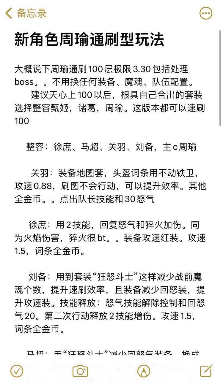 有兴趣的可以做一做看,还不是特别完善,如果哪位有好的良性的建议,希望大家不吝指教。 阵容搭配: 各人物魔魂配置: 夏侯渊: 周瑜: 刘备: 徐庶: 马超: 装备配置:夏侯渊--随便什么都行,异常套也可以,嫌麻烦不带也行,两条防闪避或者主手防闪避,主手副手有破甲就行,攻速2.1,两个专属符文,目的是为了打个流血,没有也问题不大,后面有了再加进去。 刘备--随便,可以带一套黄金将军套,给点地图攻击,攻
