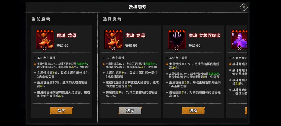 刚开始玩的时候,在论坛里看好多攻略推荐诸葛亮魔魂,有主龙母的,有主冰龙的。主龙母的前期爆发高,主冰龙的Boss持久战比较好用。我觉得我更需要高爆发来帮我早日度过前期(永夜100层),所以选择了主龙母。这里也建议大家选择主龙母。 主龙母之后,就是要杂其它的魔魂,毫无争议的是第一个杂恶魔之王,第二个杂冰霜巨龙()。但是到第三个就有问题了,我当时看几个攻略说杂冰霜护卫或者鲜血蜥蜴,这两个都是输出转化护盾