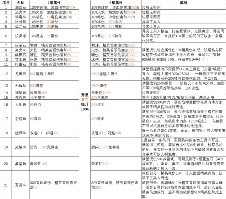 全魂珠21种,跟升星魔魂一样,每次都是黄字提升100%。目前官群大佬们也测试过:碎金石、离火珠、幽影石、玄水珠、打雷石 这五种珠子,实际是加的精英伤,但不算入面板。类似于龙母buff的暴击一样,能突破面板限制。就是面板90%精英伤的话,装一个1星打雷石,并且主c是雷伤。那么伤害计算的精英伤就是90%+6%=96%,就会突破了原本面板限制的90%。但圣灵珠不可以,他是直接加入面板的。后续更新版