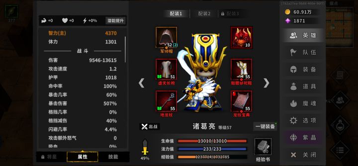 前言:此游戏游戏时间一个月起步,所以不着急,签到奖励和日常副本很重要,可每天十分钟亦可每天n个小时,攻略目的让新手们少走弯路。第二点游戏本质就是刷装备选装备洗装备提升所需属性来推关秒怪,同时依靠各种辅助来增伤、加暴、回蓝、回怒、改变行动条,所以通常情况下主c就一位,我方主c出手一次结束战斗,这就需要寻找群攻打手推图,boss打手打boss。目前来看能用做开局推图的有3个:庞统,诸葛亮,祝融。其