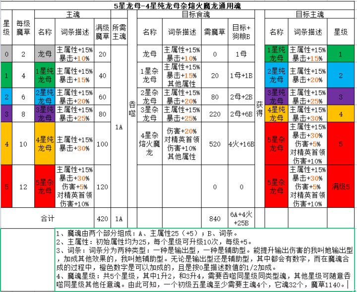 相信很多小伙伴和我一样,刚玩游戏对魔魂很陌生,甚至不敢随便乱弄。下面我就来简单讲一下我对魔魂数据的一些总结。先上表这个表已经是我的智商上限了,希望大家多多担待。表中魔魂是以龙母为主魂入手,且以龙母为材料魂合成到纯龙母4星,再杂入一只4星熔火魔龙,这算是一个通用魂吧,所有系伤害都能用,主要是需求30暴击加成,可作为后期娱乐参考,新手不推荐。总结:通过上表可以看出,一只五星魂,至少需要主魂4个,它