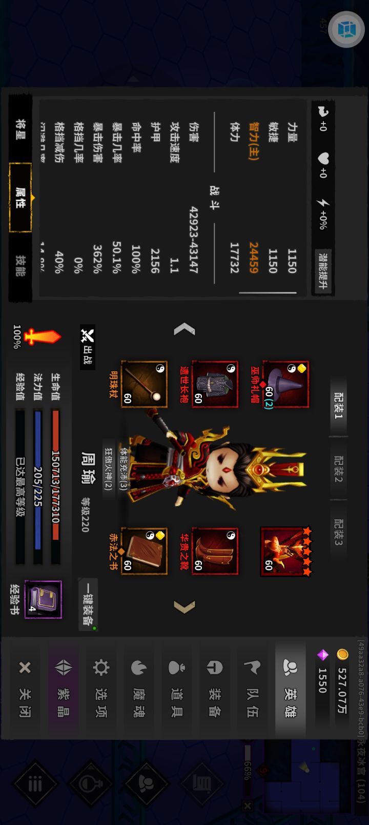 8月2日开始玩,前面20多天都在一周目梦游,就这两天主要的几个魔魂齐了,试了打世界之石,一发不可收拾,直接撸到了9周目。装备也没有几件,主要是无限黄忠和附魔周瑜立功。心得:前期别搞宝石,就搞魔魂,我天心现在都没买,但也升了很多低级宝石,浪费了很多钱。周瑜弄个高级黄宝石给副手就行,其他随意,后期再慢慢攒。