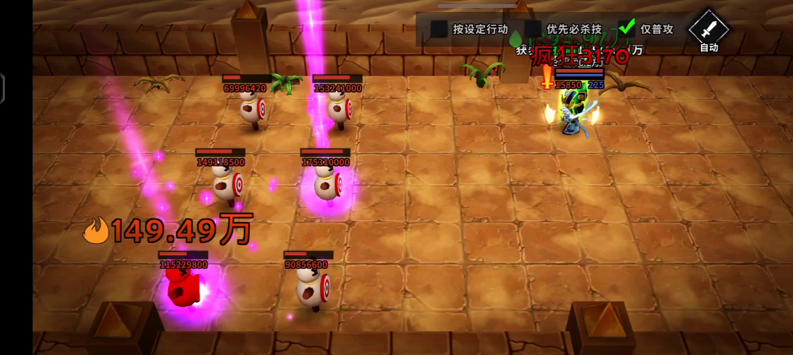 哪位大佬可以给我这个新手点建议,我诸葛上害上不去,上去了又不稳定。 武器有必大词条,没装,为了满暴击。副手已经把21%暗伤替换成40%最大伤害。 感觉最大伤害词缀太少了,得准备点装备。 目前稳定红字伤害是23-25万左右。 魔魂三星纯墓穴,龙母有个0星的。 纯狼1星,刘备队长带纯骷髅2星。 夏侯惇带的0星熔岩巨人开局晕2怪。 目前徐庶1速,夏侯渊2速,刘备3速 武器还有火龙杖(卓越暴击的)、秘法统御(带个孔)