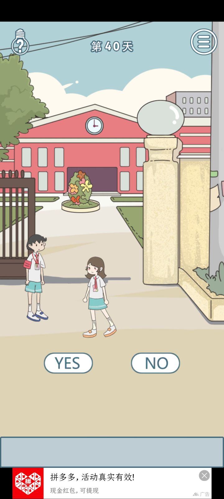 通关记录哈哈哈哈,在我手机里住了好久的游戏,一直忘了玩,今天一口气通关😋印象最深是二十关,居然要回到上一关,这关卡了,看提示过的最后一关让我沉默,好家伙,终于轮到主角当门口的值班生了,都没有学生证铁定要拦住啊,结果居然通关失败……把两个人都放进去反而成功了,这啥,循环吗😓