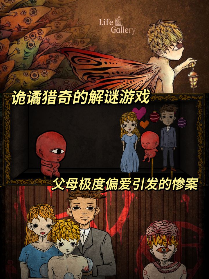 游戏:人生画廊平台:Steam+iOS +安卓最近手机刚刚冒出来的解谜游戏!(其实是我之前预约终于上线了)游戏主要讲了在父母偏心+邪教的驱使下,哥哥逐渐黑化导致家庭惨案的故事,玩下来超级心疼这个不被偏爱的哥哥!游戏的画面充斥着一个诡异感,颜色各异的虫子、扑火的飞蛾、大卸八块的布娃娃,加上哥哥的自述,可以看到一个天真的小孩慢慢走向末路的过程……游戏的解谜都不难,基本没什么卡关的地方(