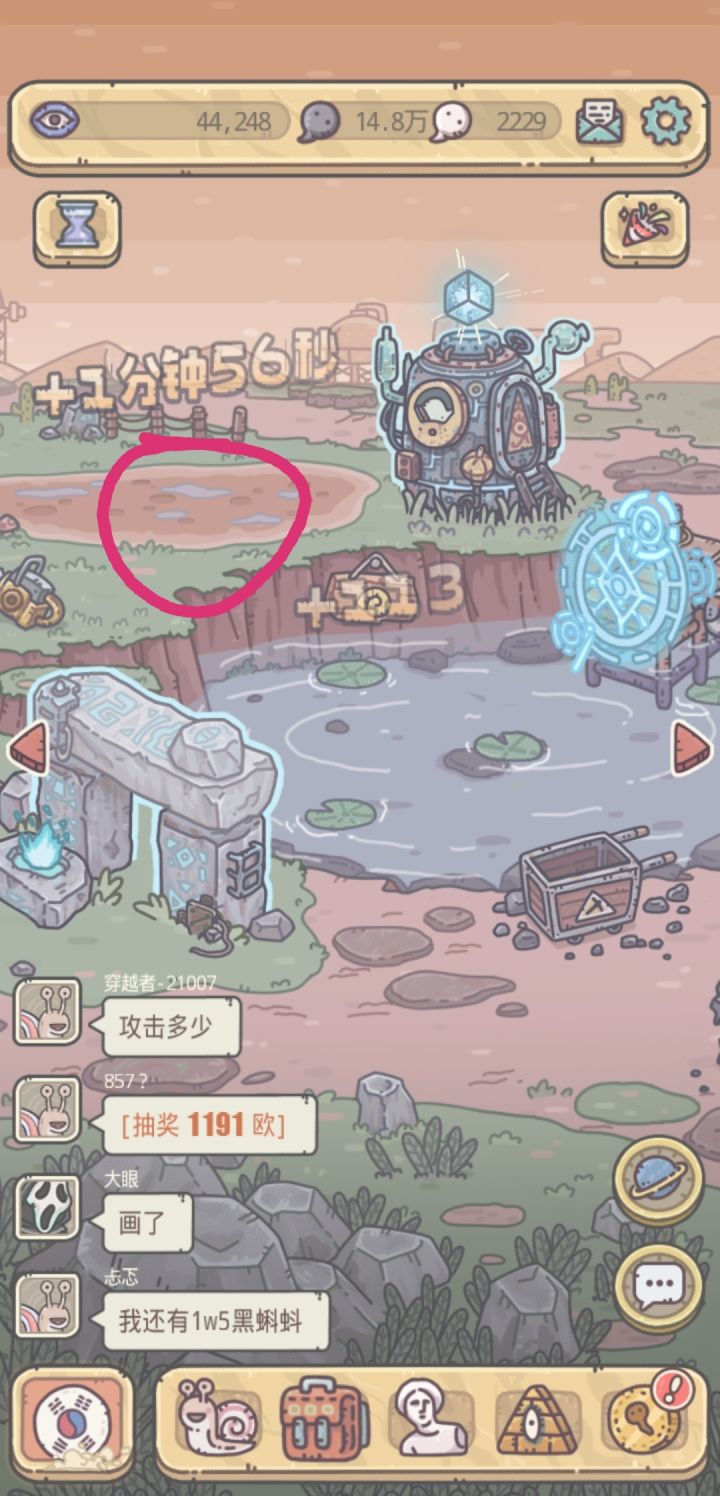 开局即使强制性新手教程所以直接跳过玩法讲解。一 : 从左到右场景1 : 车库,火箭也是在这里2 : 鱼塘,资源点,定时收货物资,祭坛也在这里3 : 信箱,信箱每天领取物资,售货机在这里(不定时跑路遛弯),婴儿房,许愿炉4 : 氪金房,蜗生挚友抽奖机的所在房间,冰箱,进化箱,博物馆快递,电脑等设施所在地(个人觉得最重要的场景)5 : 机器人,前期机器人守护着大批物资,同时你越肉他越肉,经
