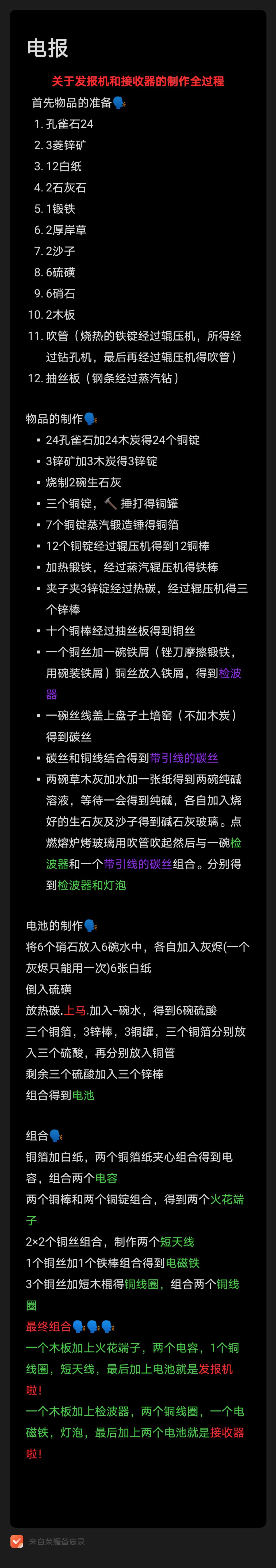 材料; 木板1个 (孔雀石)铜锭14个[8个铜线][4个铜箔][2个铜罐] 纸9个 (厚岸草)草木灰2个 沙子2个 线2个(做碳丝2个) 硝石4个(做硫酸4个) 硫磺4个 段铁1个(做铁棒) 石灰石2个(做石灰粉) 菱锌矿2个(锌锭做锌棒)制作流程 铁棒+铜线=电磁铁 电磁铁+纸=扬声器 扬声器+木板=组装中的收音机1 碳丝+3个铜线=三级管引线 (碗里草木灰+水+纸,过滤后30秒=纯碱) 纯碱+