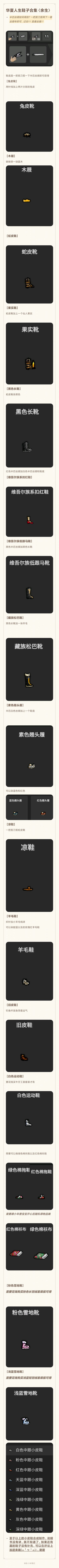 华夏人生鞋子合集〈余生〉 半匹丝绸如何得到?一把剪刀剪两下一卷丝绸布即可,记住!!!是蚕丝绸哦!! 鞋底是一把剪刀剪一下半匹丝绸即可获得 【兔皮靴】 用针线加上两片分割的兔皮 【木屐】 钢锛弄一块圆木 【蛇皮靴】 针线加上蛇皮即可 【果实靴】 蛇皮靴加上一个仙人果实 【黑色长靴】 蛇皮靴染黑色 红色半匹丝绸加白色半匹丝绸和鞋底 【维吾尔族系扣红鞋】 【维吾尔族低跟马靴】 黑色半匹丝绸加黑色长靴 【