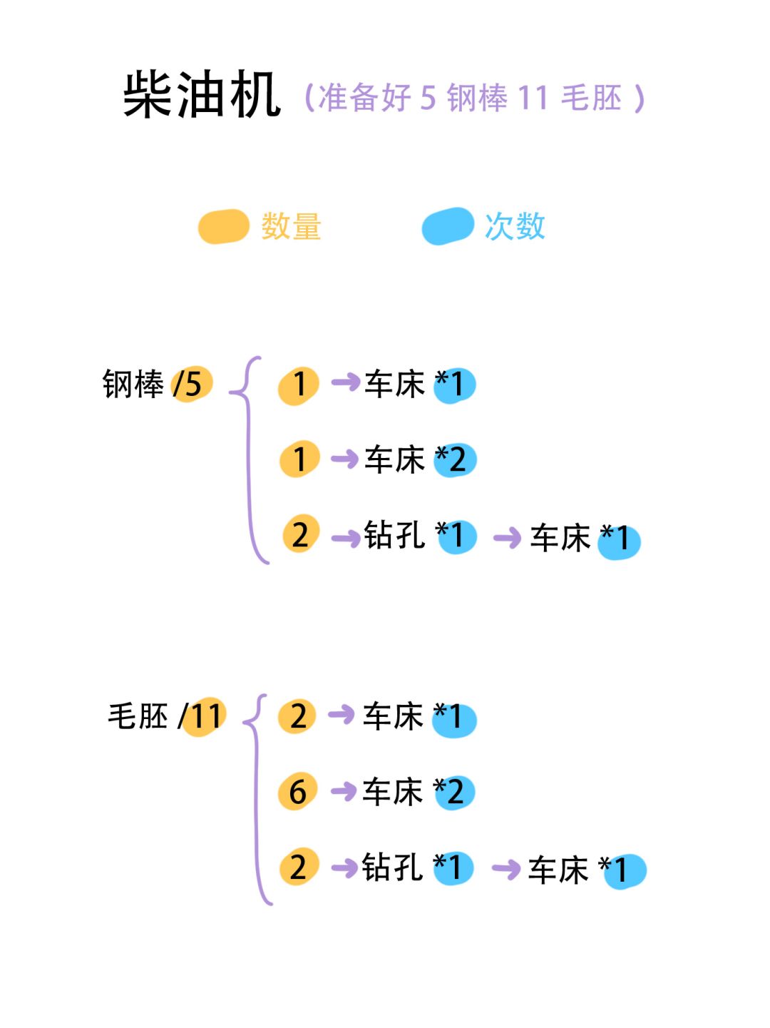 看到好多教制作柴油机的步骤教程,图文一大堆看了眼晕,分享一下我自己整理的并且一直在用的简易版柴油机制作步骤。(这只是柴油机的主体部分,不包括油箱和另一个串木头上的两个饼饼。 1→车床*1 扩展一下就是: 一个钢棒点车床一下 2→钻孔*1→车床*1 扩展一下就是:两个钢棒先点钻孔一下再点车床一下 先把需要钻孔的都做了(这里建议多准备一个钢管钻孔做油箱的那个管子),然后再按(点1下/点2下)分开放好,
