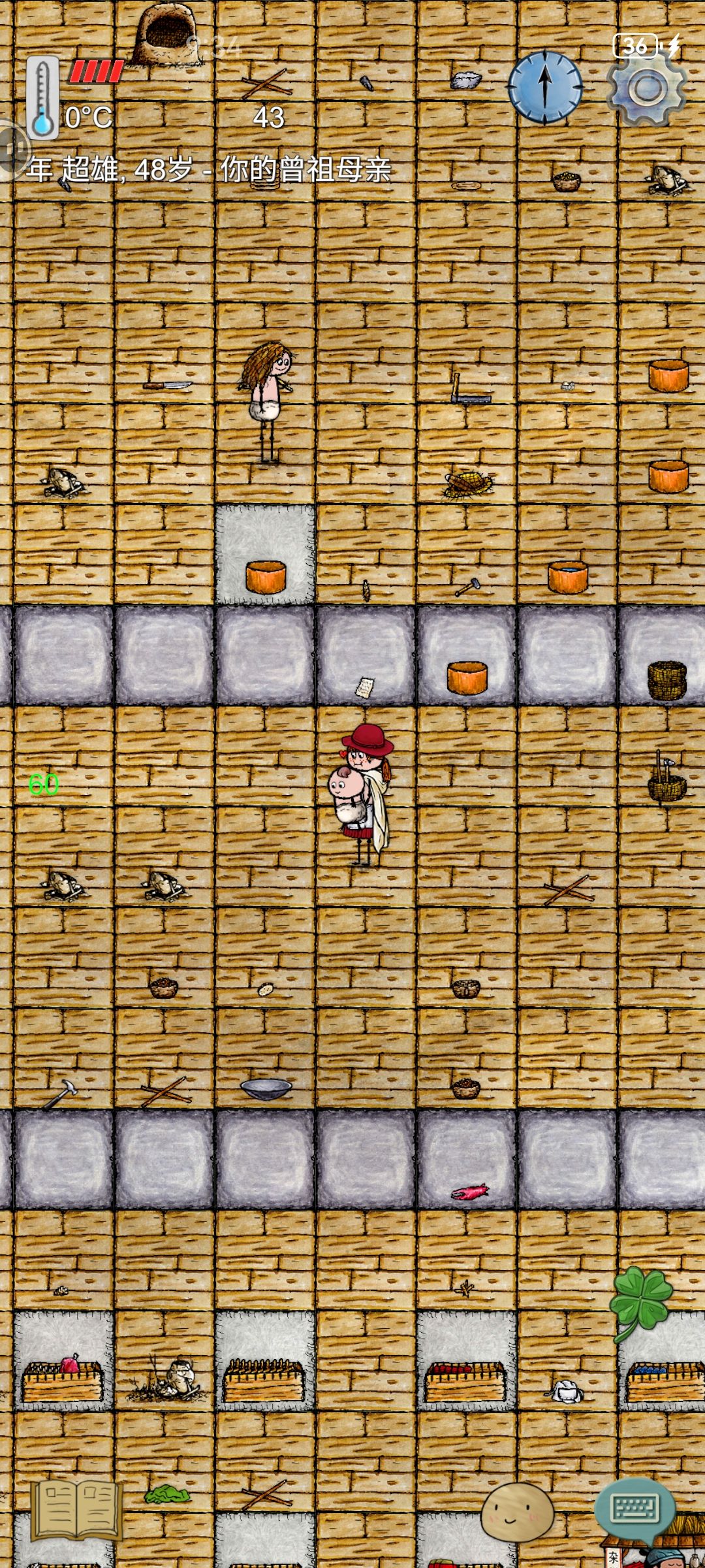 1.这里人物不会饥饿(饱食度不衰减),不会老死(可活到60+)。 2.虽然你的角色外貌会随年龄增长而变化,点击人物后左上角的显示年龄却不会即时改变,直至你拿起一件可交互物品,冻龄现象消失。[如图1] 3.新手教程进度只记录你当前处在哪一课,右上角刷新、退出至族谱再返回或重进游戏都将还原这一课的进度。 4.第二课的围墙外有一具尸骨,猜猜是谁呢? 5.不论选择新手服、活动服还是传承服开始新手教程,其围