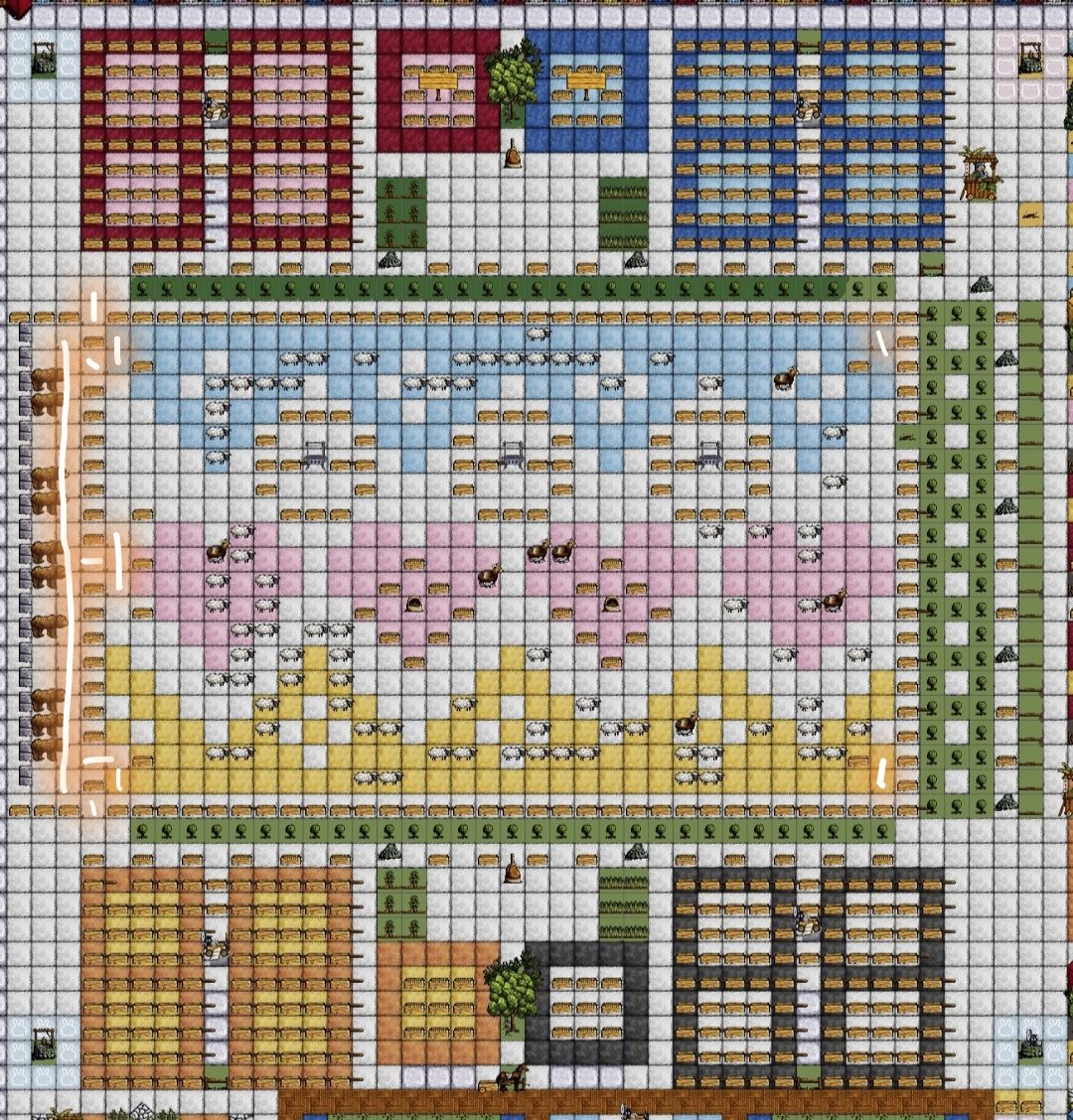 一、14区规划(农业区/染色区/烧油区/树木区/打铁区/叠食区/烧瓦房/石膏房/养老房/飞机房/厨房/羊圈/仓库/奶牛机) 二、关联分介绍(权重分数) <[树木区占地2x4或3x3关联]> 打铁区(3分)烧油区(3分) 厨房(2分)石膏房(1分) 烧瓦房(1分)染色区(1分) <[厨房占地2x2或2x3关联]> 叠食区(3分) 农业区(3分)树木区(2分) 羊圈(1分)奶牛机(1分) <[羊圈占地
