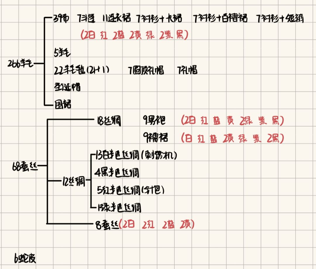 长篇无图叙述,周知。 给还没开始动手制作的“新人”们整理了一下笔记,一起来制作好看的维吾尔族系列服饰吧~ ❤️服饰包含: 男性服装:黑金四楞花帽、切克曼绿袷袢、低跟马靴。 女性服装:系绢刺绣花帽、艾得来丝绸裙、系扣红鞋。 🧡主要材料:丝绸。 男性服装:一匹丝绸×4=蚕丝×8=蚕茧×16。 女性服装:一匹丝绸×6=蚕丝×12=蚕茧×24。 全套共计:40蚕茧(5堆蚕茧)=20蚕丝=10匹丝绸。 所需