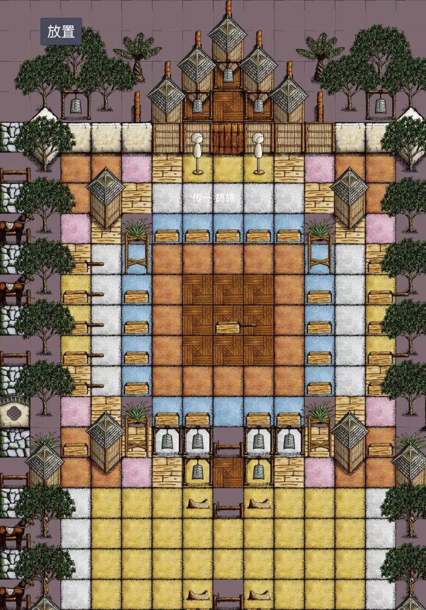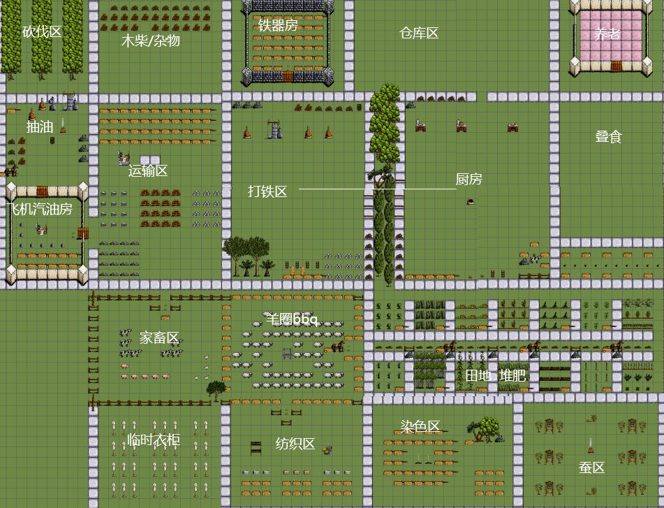 图是为了更形象表达而画的规划布局图,具体以自己需求去规划大小。 以打铁 厨房工作区为中心向四周展开的。打铁区不一定要在雨林建造,可在打铁区种两棵橡胶树和棕榈树方便做轮胎。(我喜欢下线前把风箱锁起来,所以在打铁区放了几个上锁的箱子)。厨房的上半部分用来做月饼,下半部分烤羊肉块,bbq不放厨房,一来会显得挤,二来要运羊肉麻烦,直接羊圈bbq。两个区是最常用且最费柴的区,在两个区中间种一点树,因为经常在
