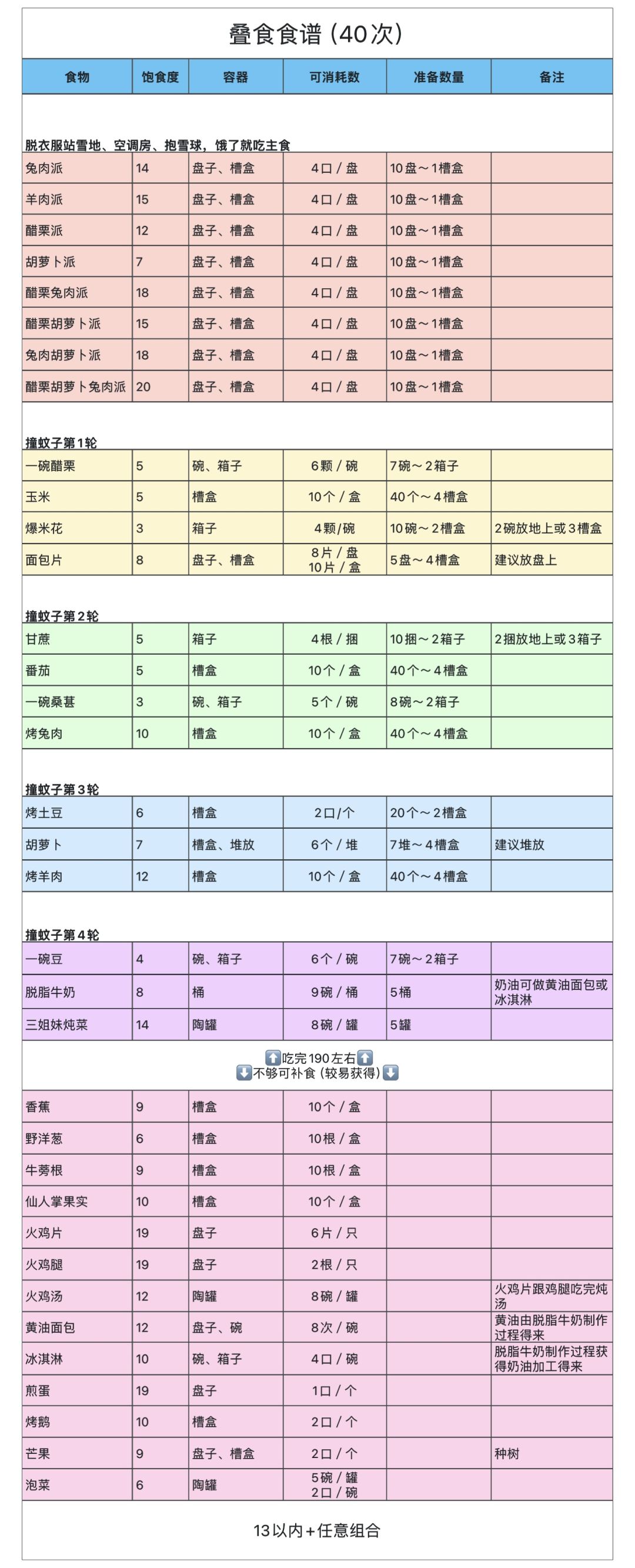 给大家分享一个自创贫富皆宜的食谱,从高到低越来越难获得,食物不重复,可以分开用也可以合起来用,有时候想随机做点什么食物用这个叠食表正好,包含所有食物不包括素饺子,猪肉虾仁饺子,月饼(成本太大),送给有需要的小伙伴们。 叠前食物用不能撞蚊子后叠食一次的食物充当,比如烤兔吃完了,可以用爆米花,全脂牛奶当叠前食物,桑葚吃完了,可以用仙人掌,火鸡肉当叠前食物。这样消耗叠前食物随机,不用一直临时准备食物,准
