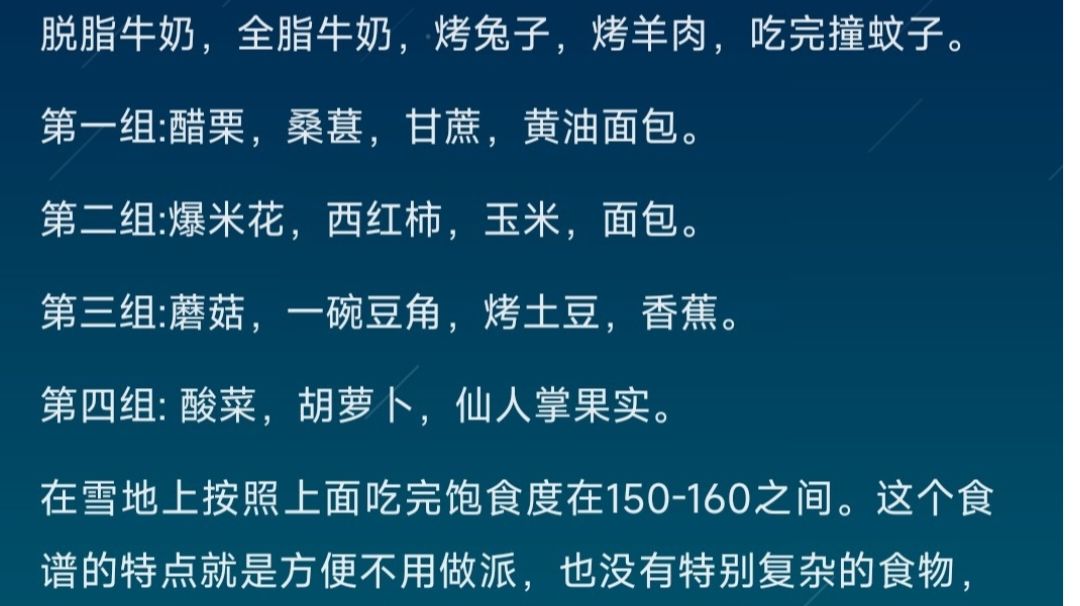 大食物: 烤羊肉,羊肉派,羊肉串(羊肉很好搞) 牛奶,脱脂奶(一次3~4桶,高性价比) 面包,黄油面包,豆卷饼(堆肥导致小麦泛滥) 胡萝卜,胡萝卜派(种地所得) 三姐妹炖菜(耐吃) 烤鱼(可选),烤虾(推荐一个四口)(原料来自羊圈永动机) 仙人掌果(可选) 烤火鸡,火鸡汤(也能吃一段时间) 叠食—— 开局吃7个大食物,撞蚊子开吃 1,碗桑葚3,碗醋栗5,甘蔗5,+大食物 2,蘑菇3,嫩玉米5,番茄