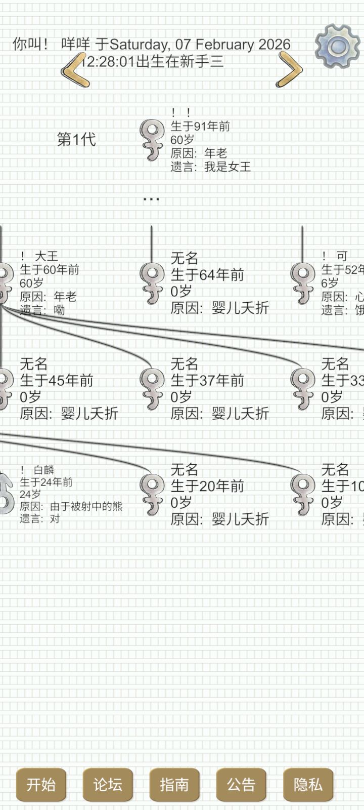 中午吃饭时候随手投了一把,在我小时候人很多的后面吃着吃着看了一下屏幕发现就我女儿一个能生了,直到33还一直生男孩,我当时真的以为完了幸好我的孙子小秃(图二)很乘,不挂机还一直干活,在我老死了以后还一直喂我女儿,后面我看传下来了今天边吃饭边救了一个家族😎
