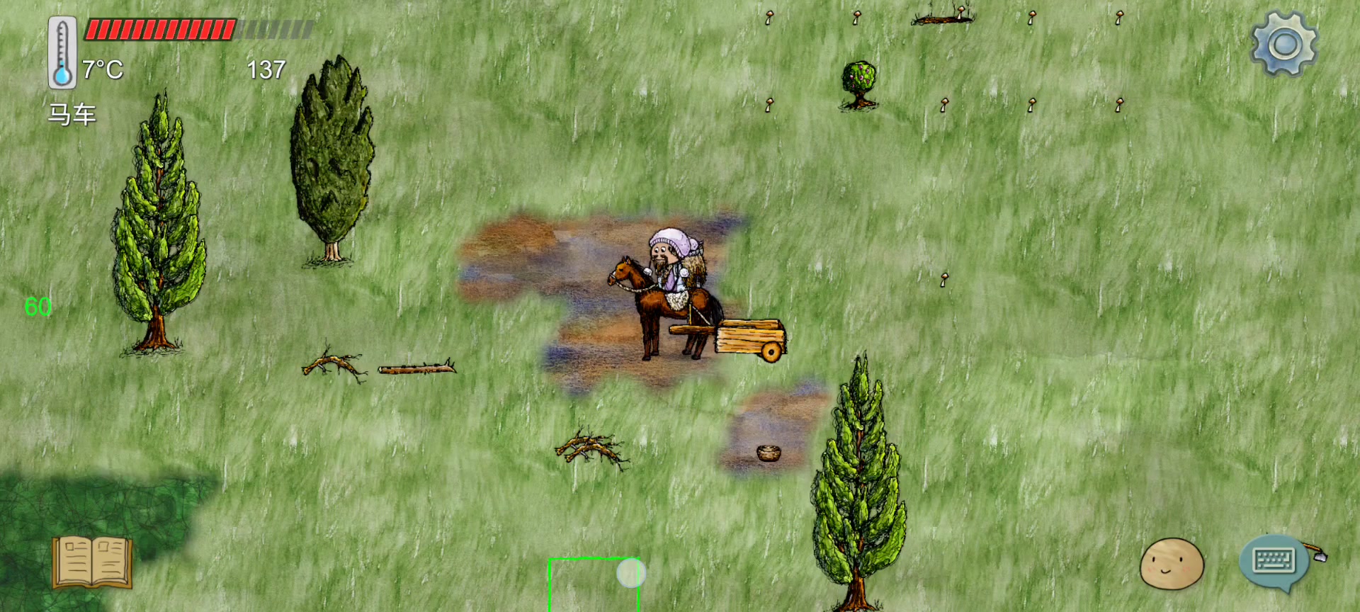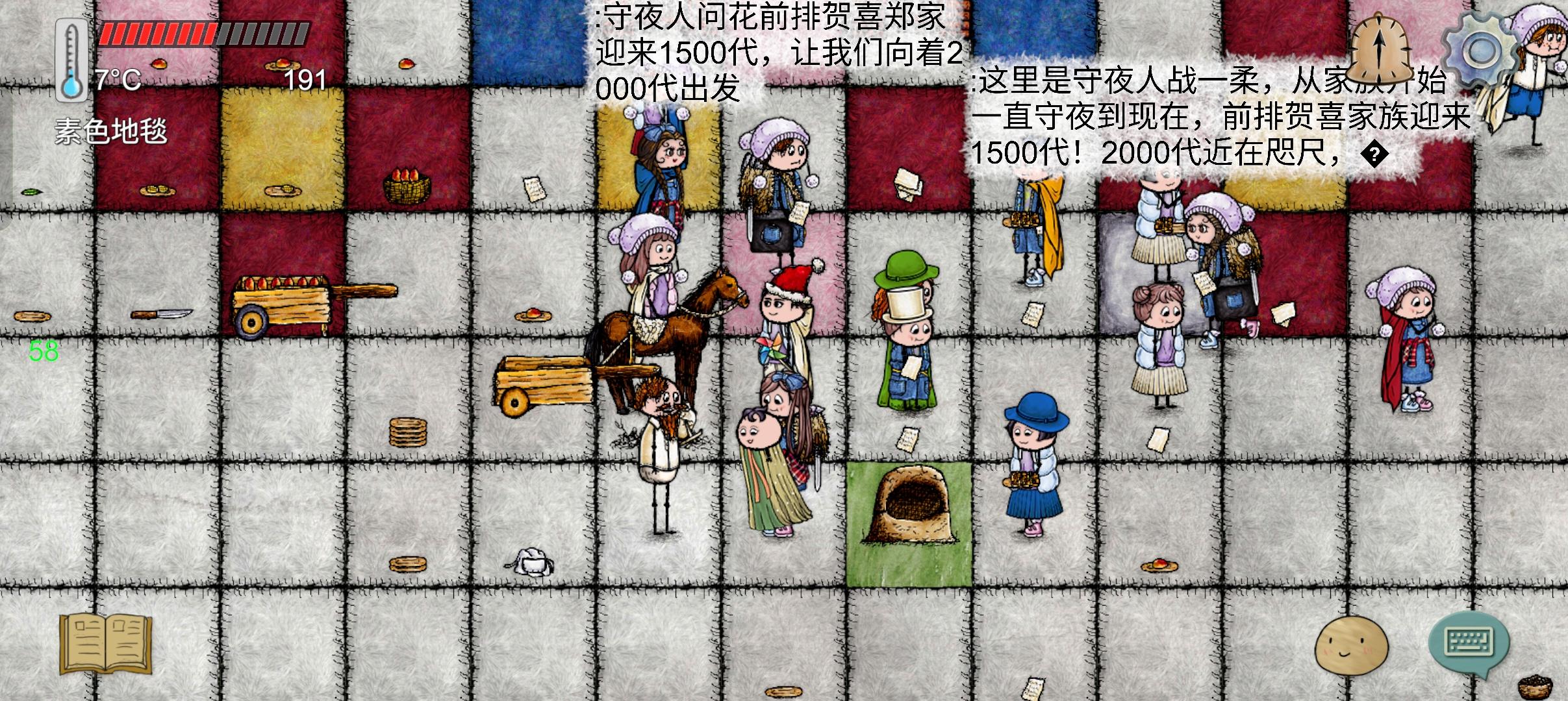 对这个游戏闻名已久的首次尝试,首先教程就过了差不多半个小时吧,然后就是出生在荒野很容易死,偶然的机会进了清家族,清一色大大真的好赞,我首先想做弓(以为打动物都用弓),大大教我的过程中我自己饿死了(小孩真的饿的好快),我还可惜了一下下,错过了这么好的大大。再开了两回短暂的生命,机缘巧合之下又回到了这个家族,大大继续教我,我学会了做弓,知道了兔子是用陷阱抓,还学了怎么锄地种植物浇水,连我砍引木材堆一起