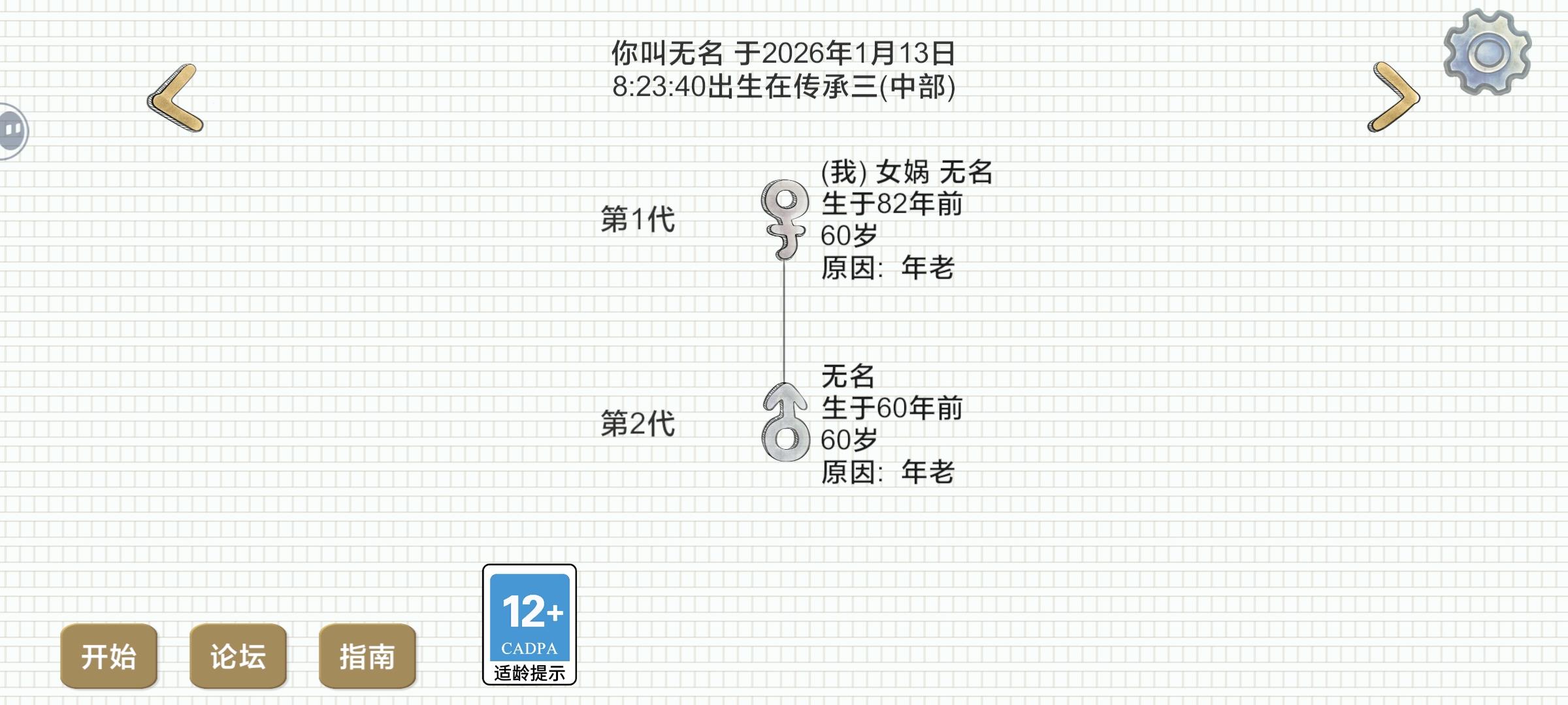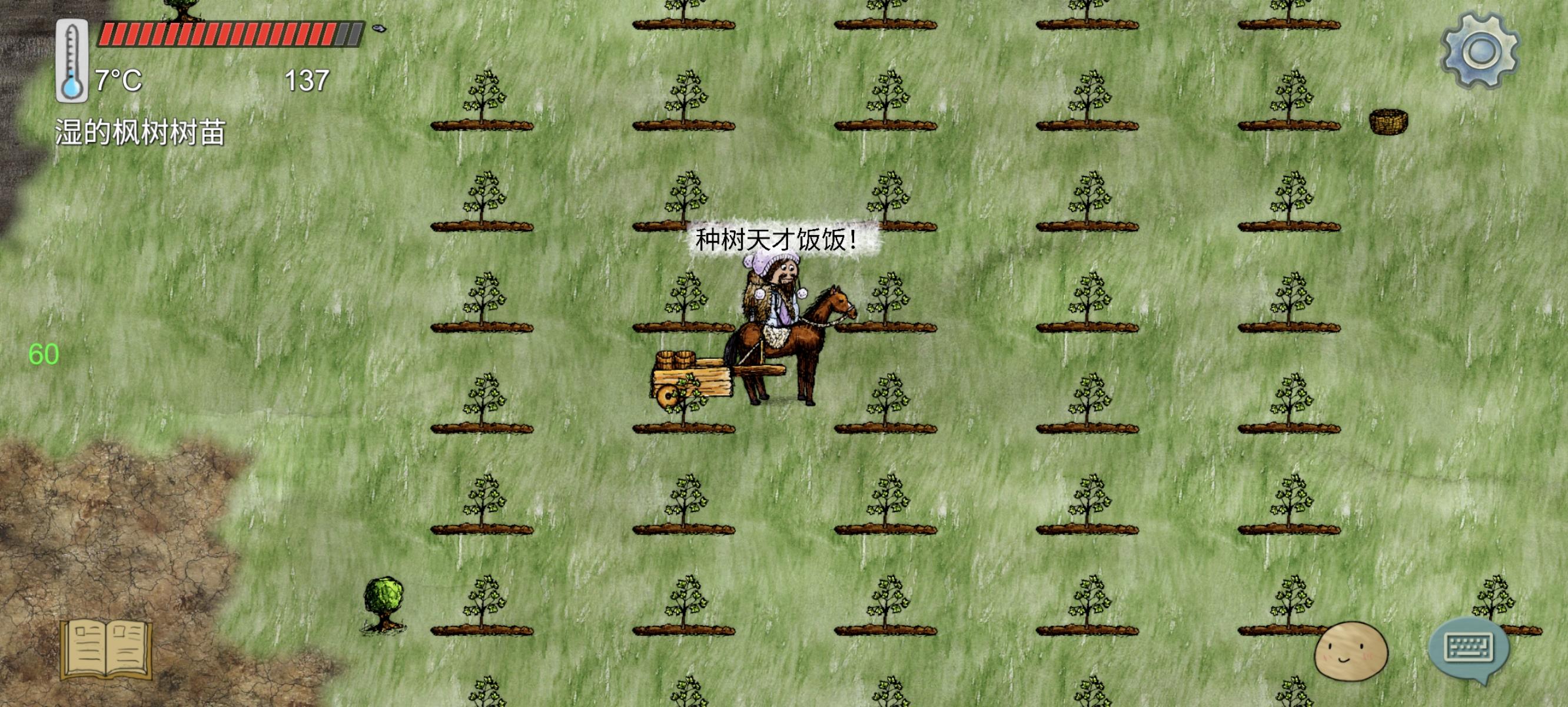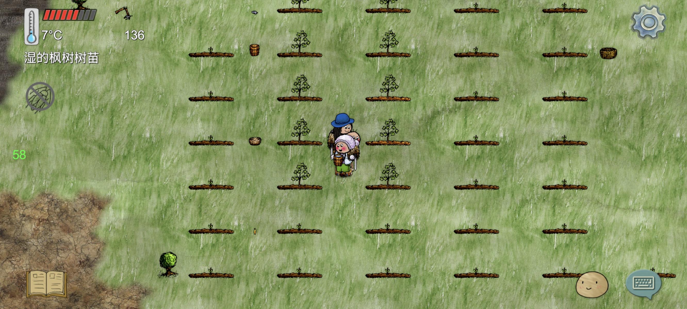 对这个游戏闻名已久的首次尝试,首先教程就过了差不多半个小时吧,然后就是出生在荒野很容易死,偶然的机会进了清家族,清一色大大真的好赞,我首先想做弓(以为打动物都用弓),大大教我的过程中我自己饿死了(小孩真的饿的好快),我还可惜了一下下,错过了这么好的大大。再开了两回短暂的生命,机缘巧合之下又回到了这个家族,大大继续教我,我学会了做弓,知道了兔子是用陷阱抓,还学了怎么锄地种植物浇水,连我砍引木材堆一起