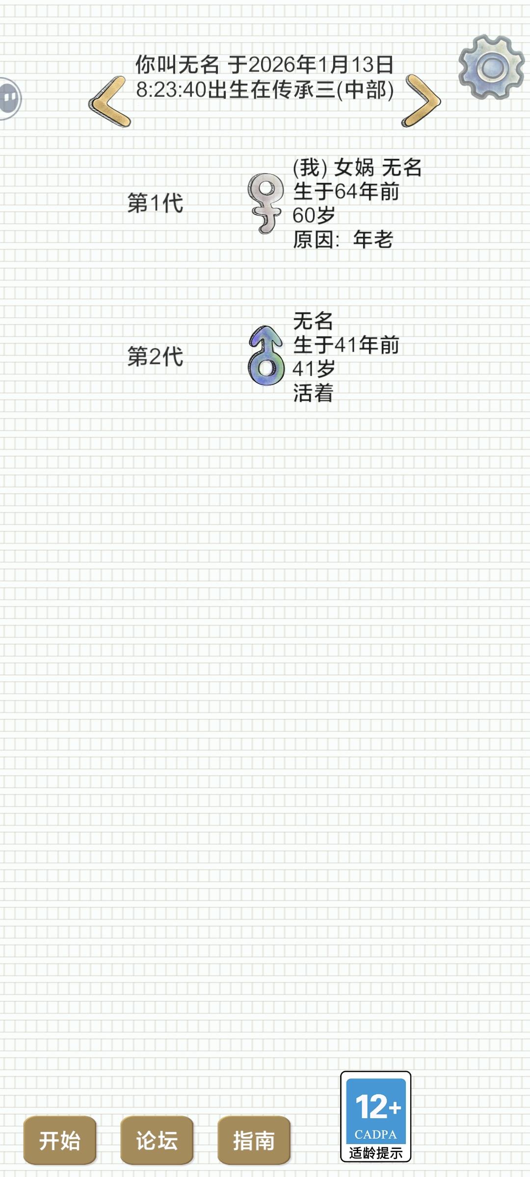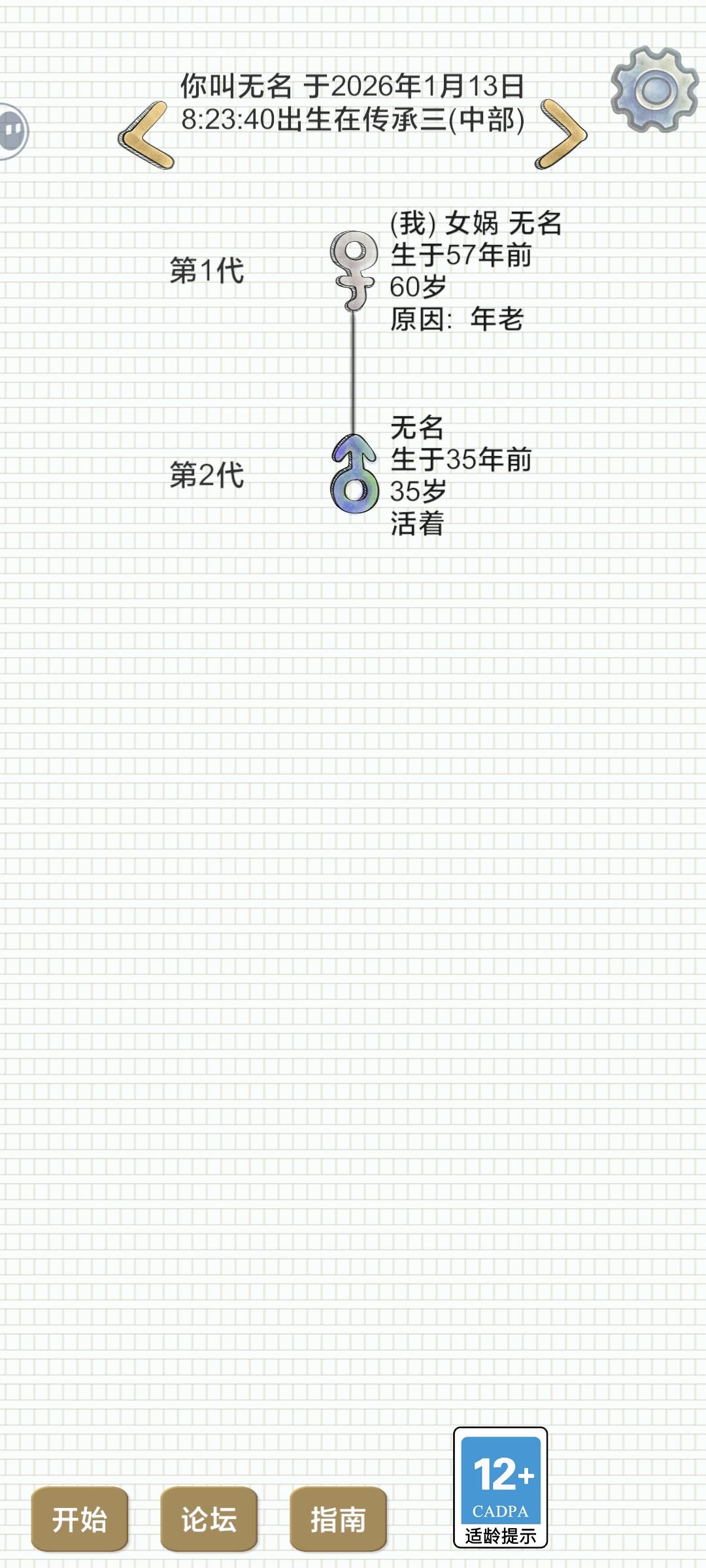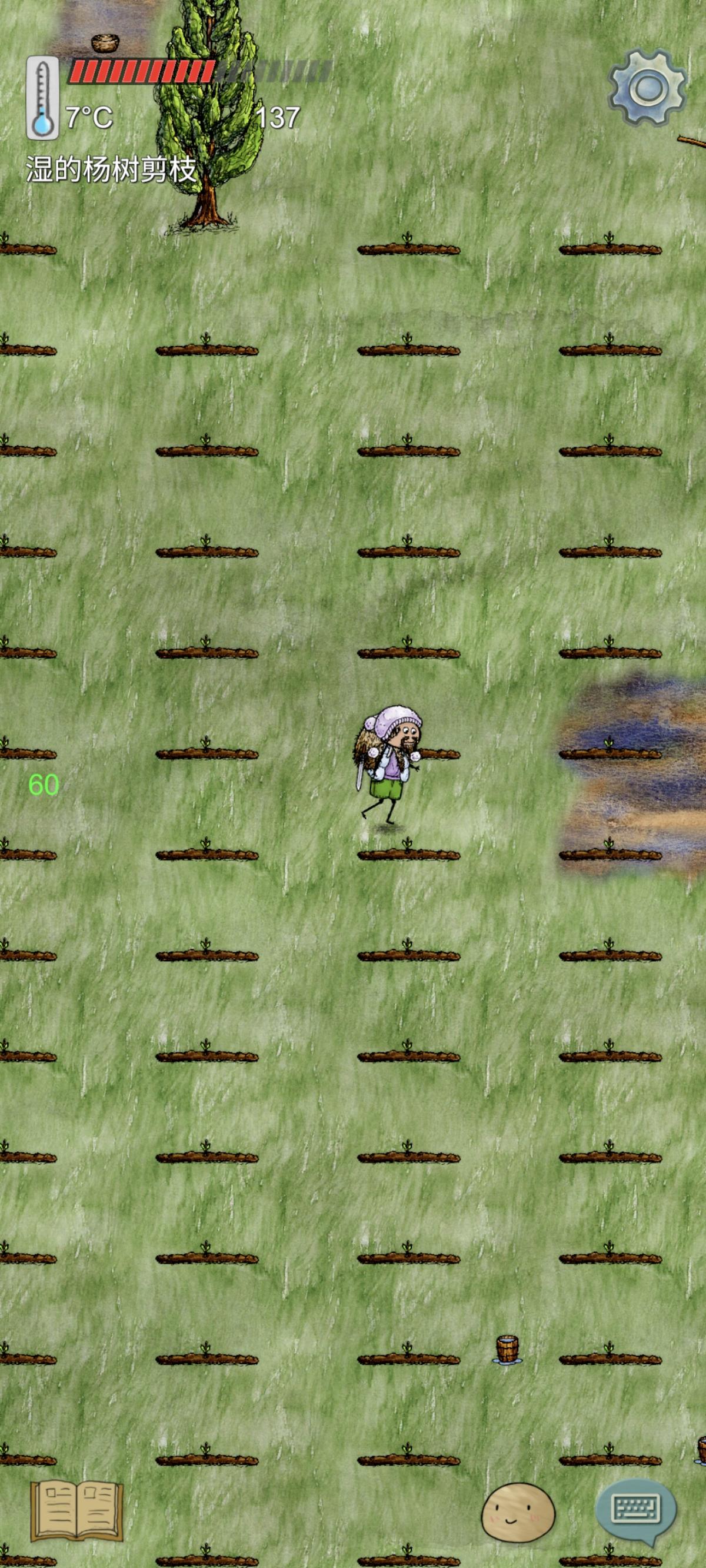 对这个游戏闻名已久的首次尝试,首先教程就过了差不多半个小时吧,然后就是出生在荒野很容易死,偶然的机会进了清家族,清一色大大真的好赞,我首先想做弓(以为打动物都用弓),大大教我的过程中我自己饿死了(小孩真的饿的好快),我还可惜了一下下,错过了这么好的大大。再开了两回短暂的生命,机缘巧合之下又回到了这个家族,大大继续教我,我学会了做弓,知道了兔子是用陷阱抓,还学了怎么锄地种植物浇水,连我砍引木材堆一起