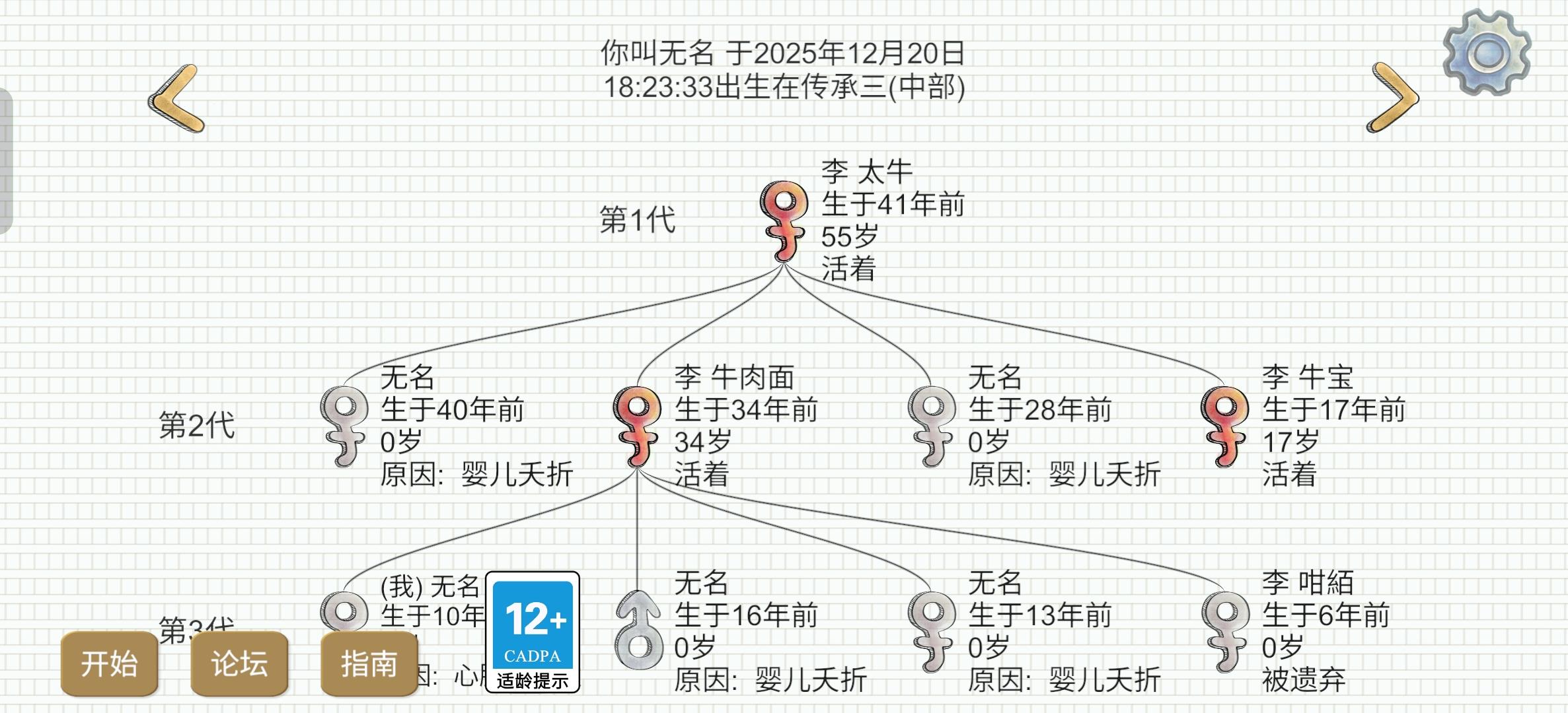 退游许久今日突发奇想回来玩一下,投到郑家,好不热闹!最初是一个叔叔给我衣服,然后我妈就把我送这叔了,可是这叔也不要我呜呜呜,最后长大了妈又回来了。妈有一个小姐妹,也就是我的姨姨,在争论谁的孩子可爱。但其实这姨是和我差两个辈分的表亲,还比麻大,但是麻管她叫妹,大家族就是乱。然后她俩都老了,姨姨突然爱上了我,要和我结婚,我不行了。我说这是禁忌的,有悖伦理,老麻也不同意,遂作罢。期间姨姨还使出浑身
