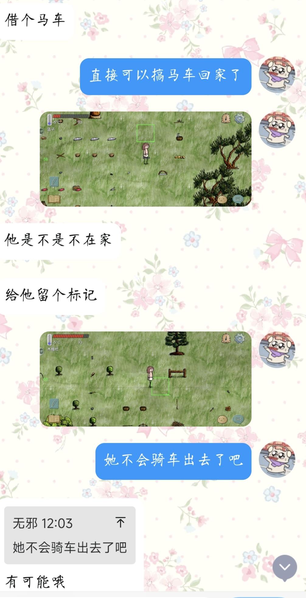 起因是我在自己家干活忙忘了被饿死了,然后今天上线准备找铁做马车跑钟回家。然后往左走了几百米发现了一大块绿草地,刚想说醋栗真多,就发现了地上放着标桩,再往上走就是一堆兔子皮,然后就看见了炉子和一些工具。震惊中,然后生了娃,给她说这不是麻麻家。娃问我准备咋办,我说我只想借东西造马车。娃跑了一圈和我说这是她不要的家。我更震惊了,根本不信,后面聊才知道是她把墙没建好就跑到别的地方建家了。最后她想