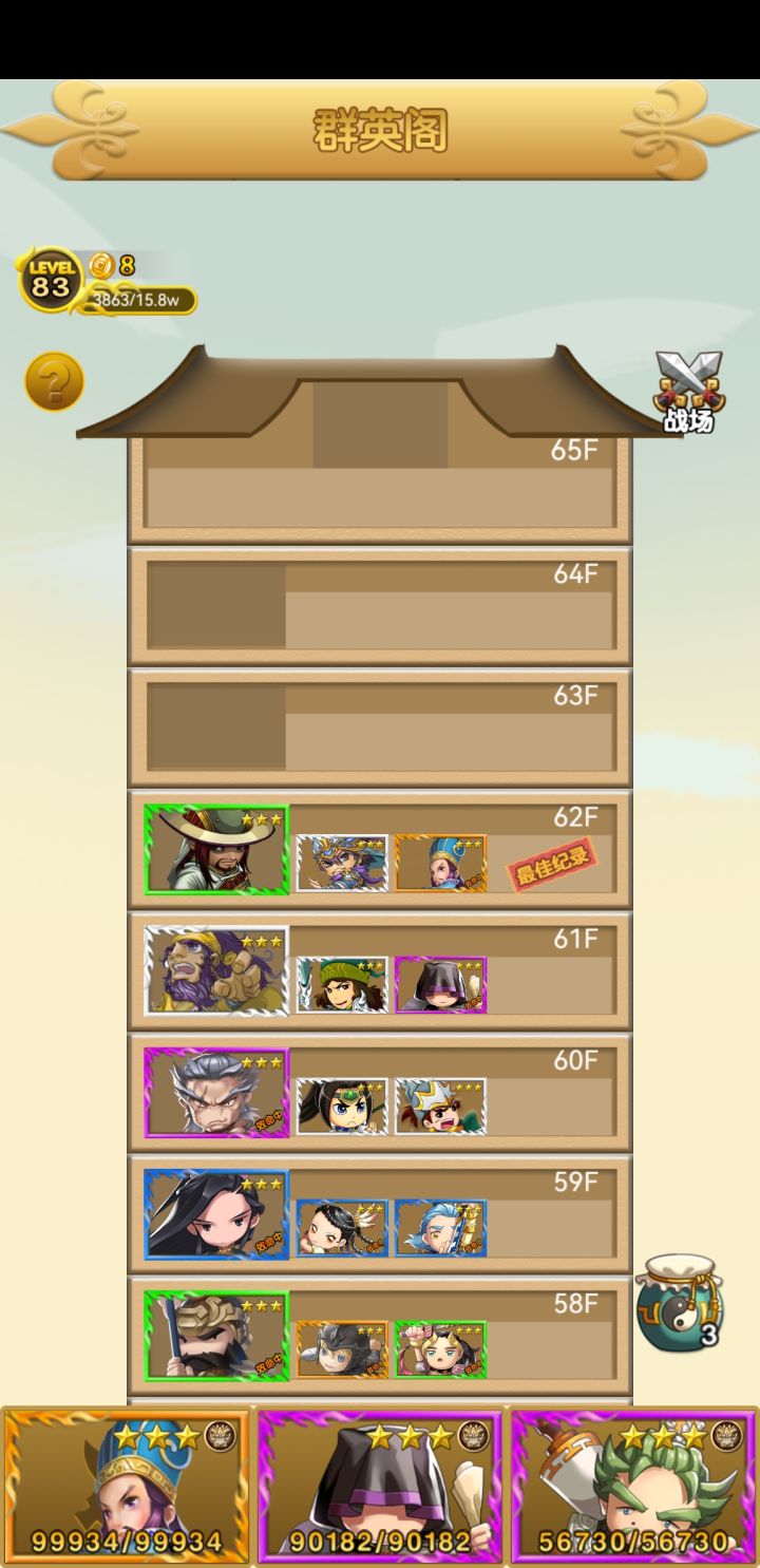 好玩是好玩,就是太肝了,还有就是无双洛阳的诸葛亮根本打不了,闪避太高了,用古锭刀根本就打不了,直接被闪避,用了七星剑偶尔出一下灵魂攻击,然后诸葛亮回血八万多,没法打了,无双塔还差两三层通关