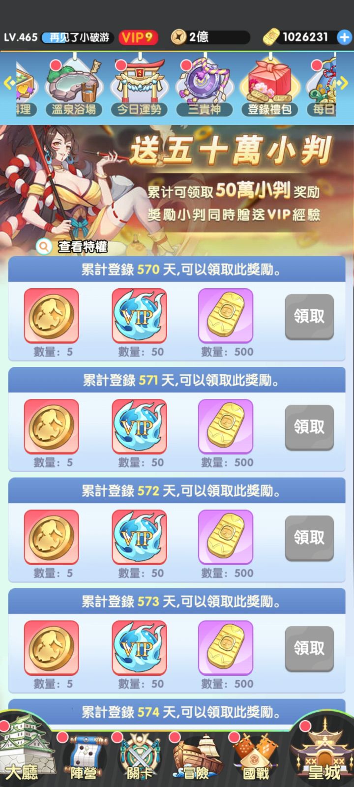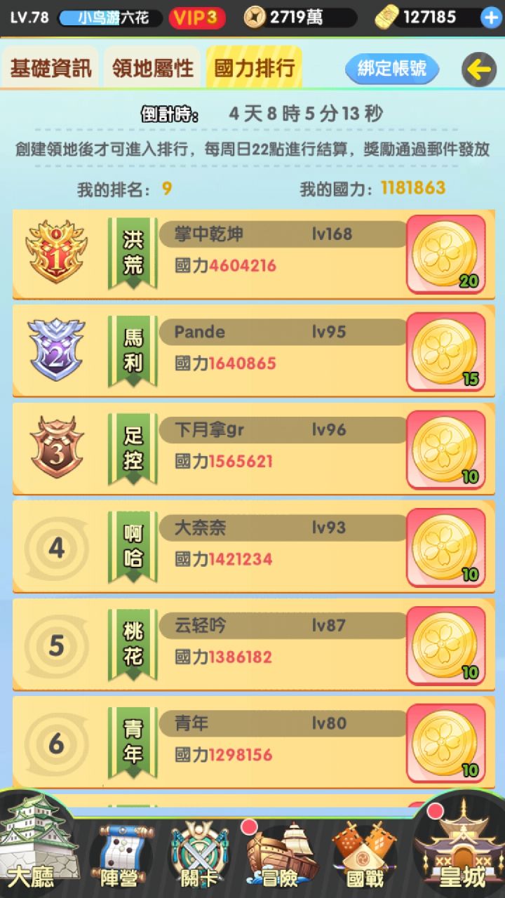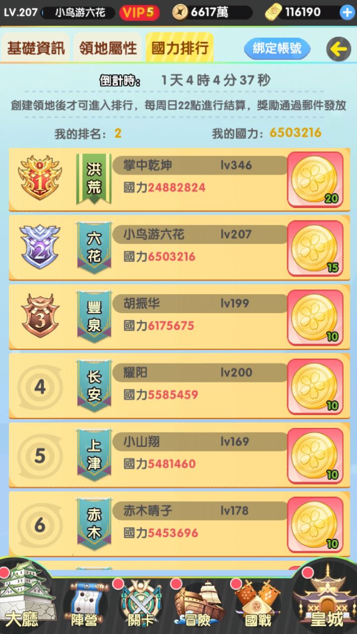1、国战中战力5000万一下,碰瓷一亿以上的,威望多。5000以上的,打的过比自己战力高的,威望多。打官员,就是那些红名的,威望多。(新手注意,国战地图中有线,连在一起的城池,挨着的城打1个讨伐,跨城打人需要2个讨伐)2、每次银行,0元购时候,42万小判,不要一次性买,看看你累计消费,和累消排行,和银行(0元购)时间,一般第一天买24+6=30万,可以得到两个SUR和一些资源。然后第二天买12万