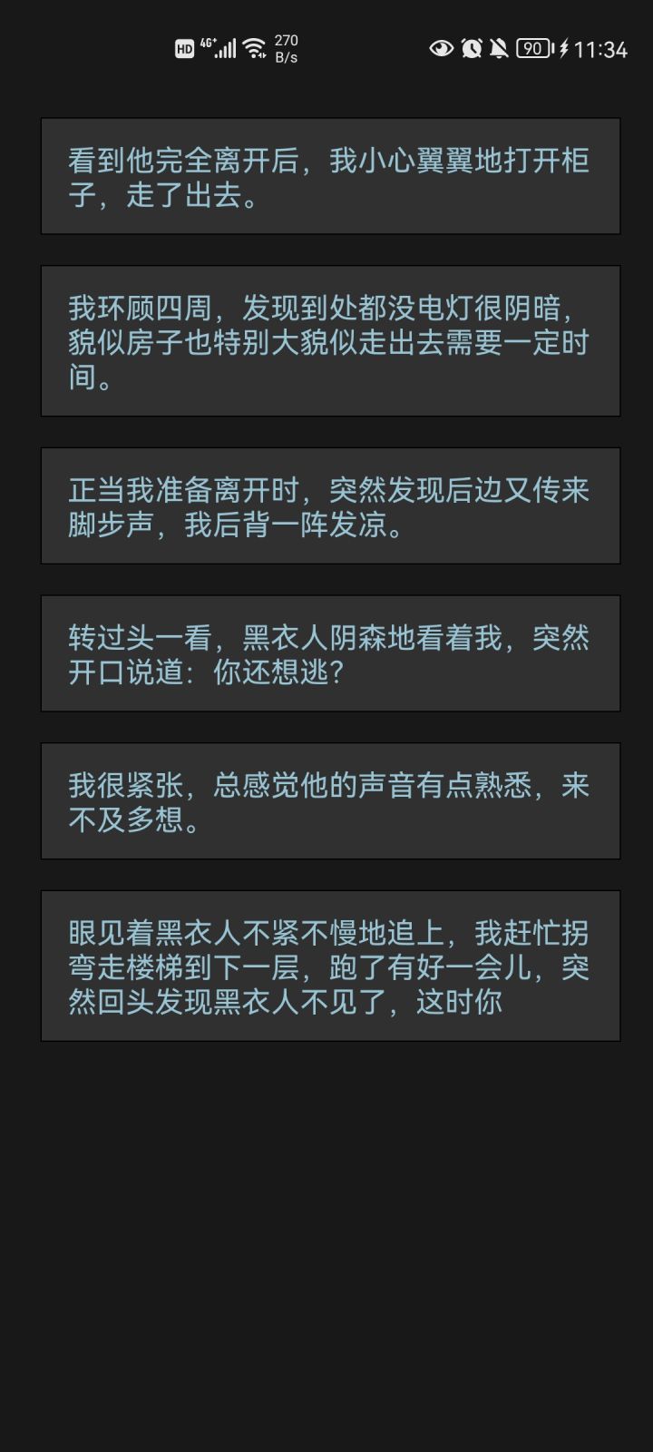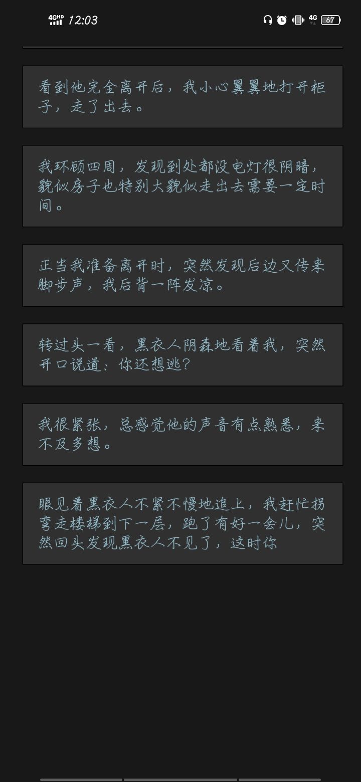 反馈一下,优点:剧情超级吸引我,缺点:出文字速度太慢了,我在选择打电话和找出路的时候只能选择打电话,因为我选了找出路以后就不动了,之后选择跟他走和不跟他走的时候选择跟他走也不动,选择不跟他走就死,所以我没有通关,如果文字出的速度快一点我会多刷几遍尝试的,这样我真的刷不动。希望增加存档功能,调快文字出现速度,希望能自动滚动。总体来说,这种文字游戏最重要的就是内容了,期待之后的优化。作者要加油呀!