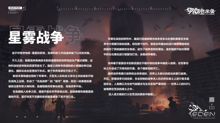 █由于对奇异物质-星雾的发现,各类科研工作迅速突破了以往的关隘。不久之后,随着各种高端技术的快速落地和世界性的生产模式调整,这种科技跃进导致的资源荒发生了。国家之间争夺资源的的小规模纷争日益激化,国际议会也变得流于形式。整个世界笼罩在不安之下。█新技术很快被应用到了军事中,大型无人机和全义体化士兵的身影开始在战场上出现,形成了“无血战争”的“保守”局面。但这一结果随后便被政治家和军火商利用,各