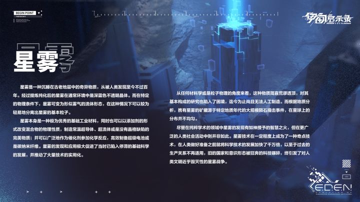 █星雾是一种沉睡在古老地层中的奇异物质,从被人类发现至今不过百年。经过提炼纯化后的星雾在通常环境中是深蓝色不透明晶体。而在特定的物理条件下,星雾可变为形似雾气的流体形态,在这种情况下可以较为轻易地分离出星雾的基本粒子。█星雾本身是一种极为优秀的基础工业材料,同时也可以以添加剂的形式改变混合物的物理性质,制造常温超导体、超流体或是没有晶格缺陷的完美物质;并可以广泛地作为催化剂参加化学反应,高效制备