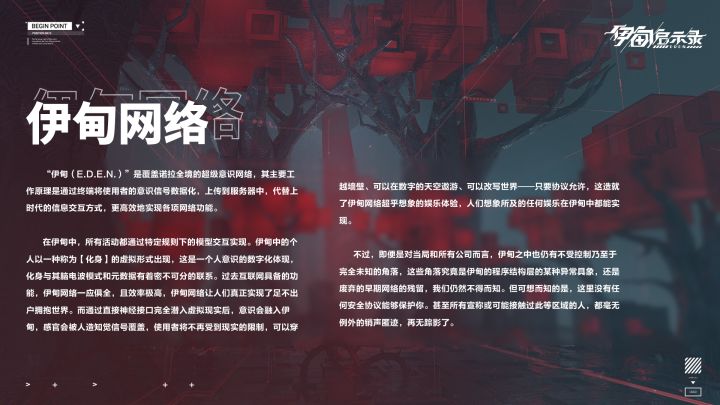 █“伊甸(E.D.E.N.)”是覆盖诺拉全境的超级意识网络,其主要工作原理是通过终端将使用者的意识信号数据化,上传到服务器中,代替上时代的信息交互方式,更高效地实现各项网络功能。█在伊甸中,所有活动都通过特定规则下的模型交互实现。伊甸中的个人以一种称为【化身】的虚拟形式出现,这是一个人意识的数字化体现,化身与其脑电波模式和元数据有着密不可分的联系。过去互联网具备的功能,伊甸网络一应俱全,且效率极