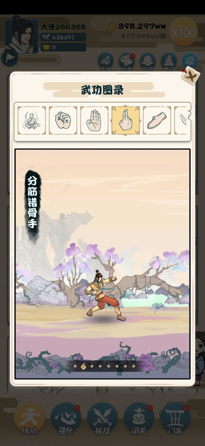 行走江湖,修炼功法,如果独自苦练而没有外部引导,十分容易走火入魔,轻则费尽修来功力,重则攻心而亡,今天小助手就来帮助各位大侠做好功课,学习正确的练功姿势~江湖武功知多少?江湖中的武功总共有10大类,包括内功、拳法、掌法、指爪、腿法、轻功、刀法、剑法、枪棍、暗器10类。江湖武功并没有最强武功,一种武功总会克制另一种武功,也总会被另外一种武功所克制,大家平衡发展才是王者。每种武功又有8种不同武功招