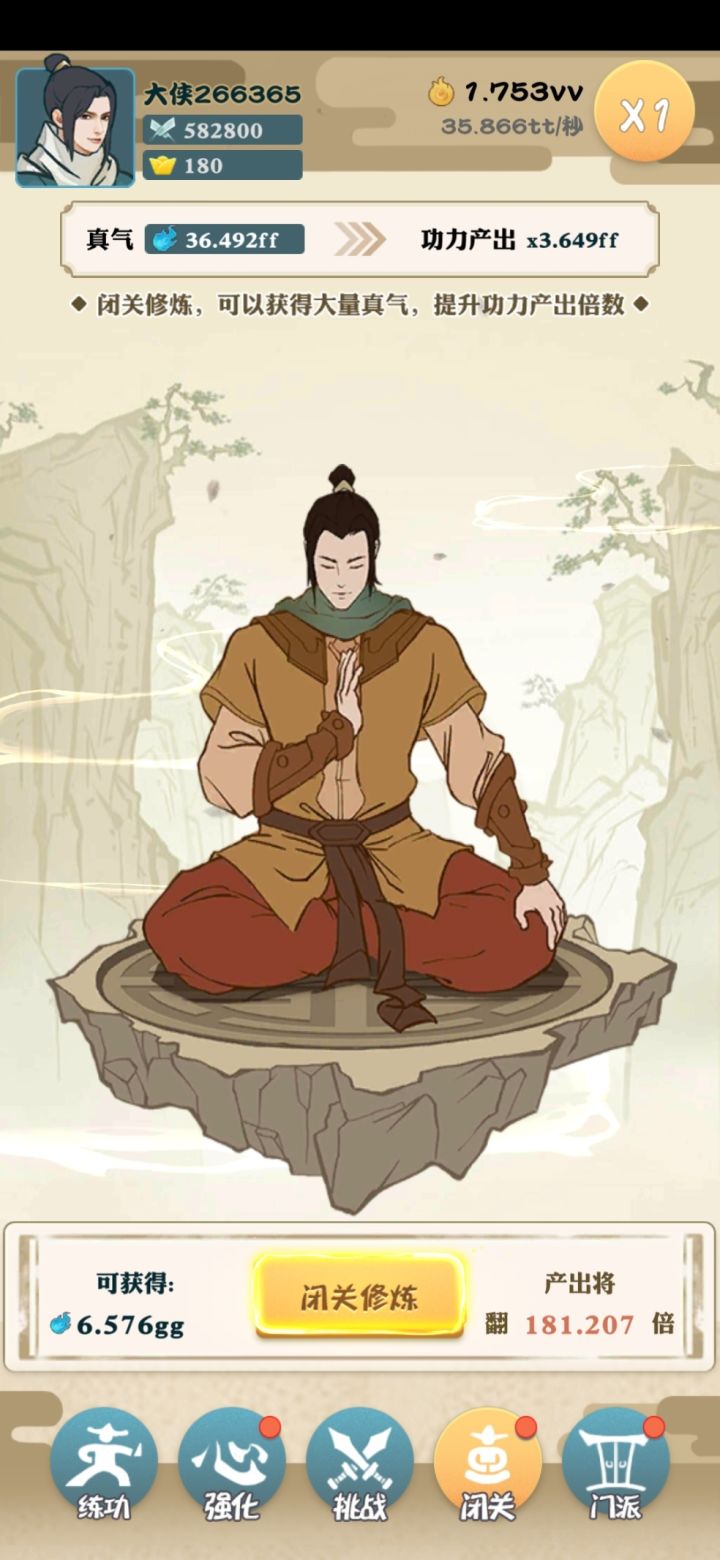 夏日的风热热的,吹得小助手不想动,似乎与梦想中的大侠越来越远,肿么办???相信很多江湖萌新都有小助手这样的“江湖烦恼”,其实要成长为江湖中人人羡慕嫉妒恨的大侠,还可以吹着空调来个闭关修炼,让自己分分钟追上那些江湖中最勤快的人。哎呀,小助手竟然不小心说漏嘴啦~~什么是闭关修炼?闭关修炼能产生大量真气,而真气可永久性大幅增加所有武功的功力产出。当大家累积功力达到一定功力值时,就可以通过闭关