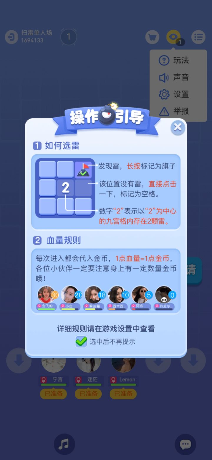 以9宫格为一周,一周为3X3的形式,9个格子的中间会有数字,如:若数字是1,那么以“ta”为中心的8个临近的方块就会有1个炸弹,若是2,周围就有2个炸弹