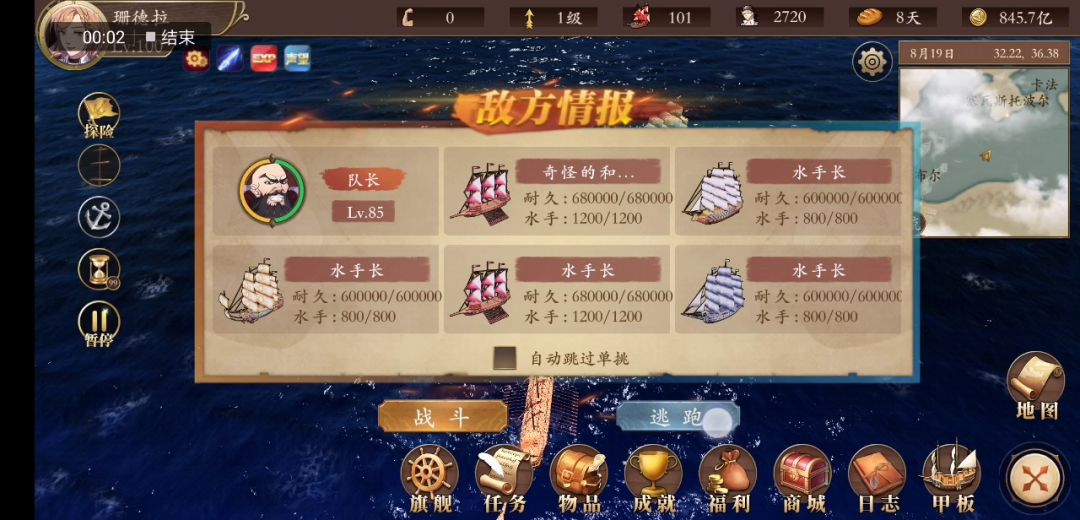 1水手飘在海上,自己完成击杀5000海盗任务