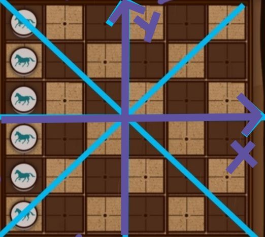 〖放置攻略〗:不在两条最长斜行处放置棋子(图中蓝线部分)。放置第1枚棋子,第1枚棋子中心对称位置放置第2枚棋子。再放置第3枚棋子,检查与前2枚棋子不在同一行/列/斜行,第3枚棋子中心对称得到第4枚棋子。再放置第5枚棋子,检查与前4枚棋子不在同一行/列/斜行,第5枚棋子中心对称得到第6枚棋子。〖中心对称〗:某棋子关于y轴对称棋子与其不在同一列/斜行,再关于x轴对称一次不在同一行/列/斜行。也就是棋