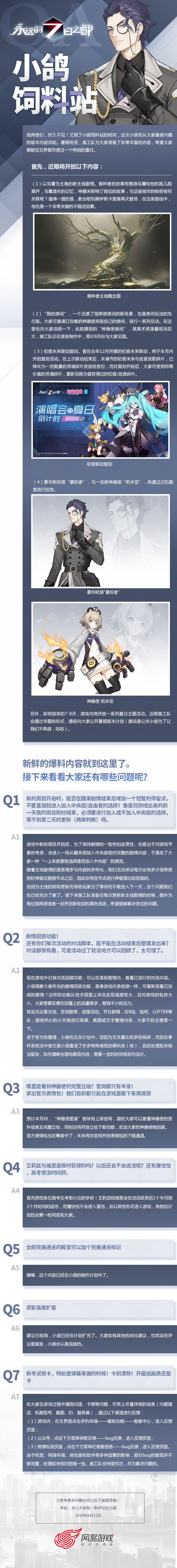 #永远的7日之都# 【小鸽饲料站】新鲜出炉啦!此次小鸽带来非常丰富的内容以及施工队各种问题的解答。 接下来的更新又有三位新神器使即将来到交界都市,新神器使之一屠怯怯亮相;恋人·奥露西娅新时装终于到来!还有指挥使们很关注的问题:何时将有男神器使主线?不同部位的装饰是否能实现同时穿戴?以及关于新场景的开发问题,一起来看看小鸽是怎么回答的吧~