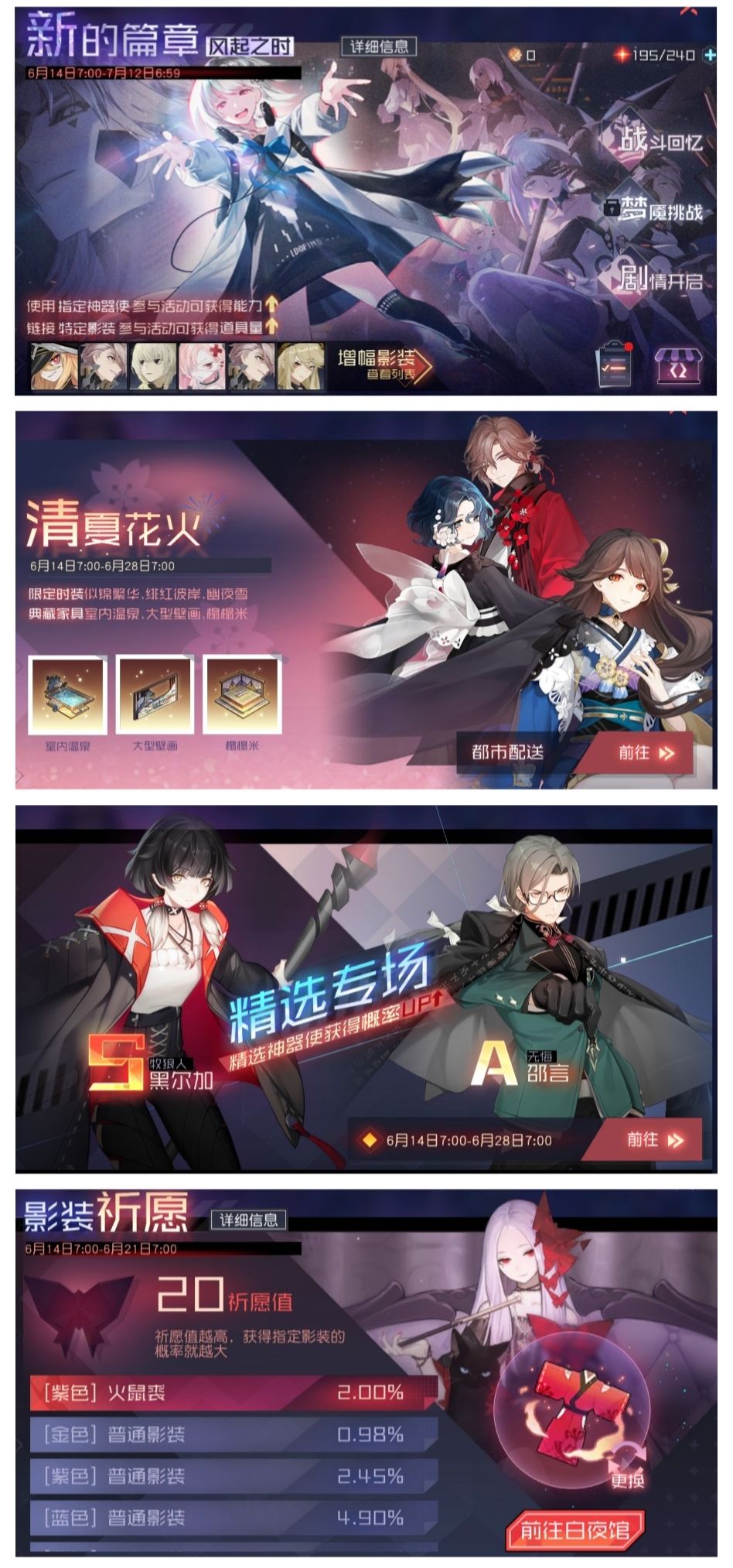 官博公告:https://weibo.com/ttarticle/x/m/show#/id=2309404968037924077584&_wb_client_=1 ○周年_月下异想曲 ☆活动商店:杰诺尔及专属影装 ○都市配送_胧月的茶会 ☆黑雪姬(安) ☆琉璃之绊(安托涅瓦) ☆雨雾蜃气楼(夜) ○限时挑战 ○精选隙间 莉娅、韦迪 ○幻彩三期