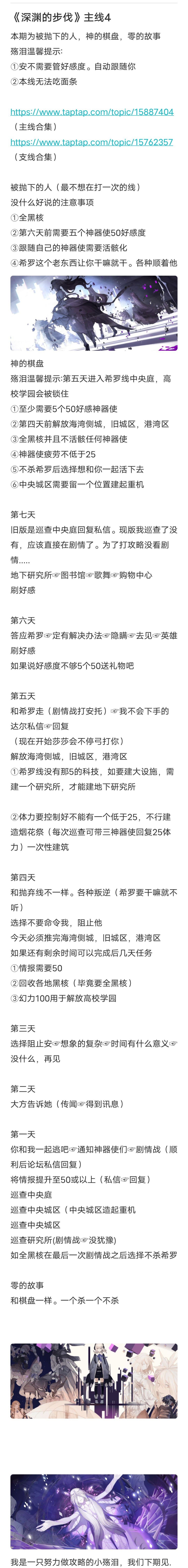 https://www.taptap.com/topic/15887404 (主线合集) https://www.taptap.com/topic/15762357 (支线合集) 期翼者的飘零 开始安托会和你说私信 第七天 中央庭搬家旧城区 ①巡查一次旧城区(战斗:挂机即可) ②巡查第二次旧城区(挂机即可) ③巡查第三次旧城区(挂机即可) ④建图书馆并且宅一天 晚上雷音蕾娜会来轮流打你(挂机即可,