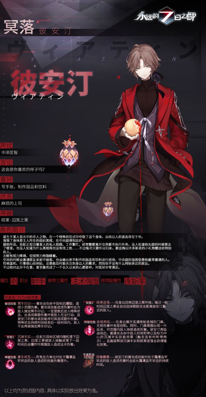 指挥使们晚上好~今天7都督将为大家带来,新神器使彼安汀、观月绫的情报资料。他们的到来会给交界都市带来什么变化呢?快和7都督一起来看看吧~「彼安汀」- CV:中泽匡智 诞生于某人目光中的非人之物,在一个特殊的仪式中夺取了这个身体,从而以人的姿态存在于世。背叛了身体原主人所在的组织黑棺,在中央庭得到庇护。据他所说,目前正担当着某人的私人助理。工作繁忙,经常需要离开交界都市执行外务,没人知道
