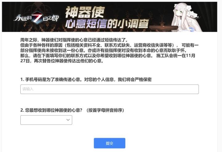 周年之际,相信不少指挥使已经收到了神器使们心意短信啦!(欢迎在评论分享一波哟~)部分没有收到短信的指挥使,可能是因为运营商问题、手机软件屏蔽或者官方没收集到您的手机号。请在下面的问卷中填写您的手机号以及希望收到哪位神器使的心意,已经收到过短信的指挥使大人也可以填写哦!https://survey.163.com/htmls/uq8raq/paper.html
