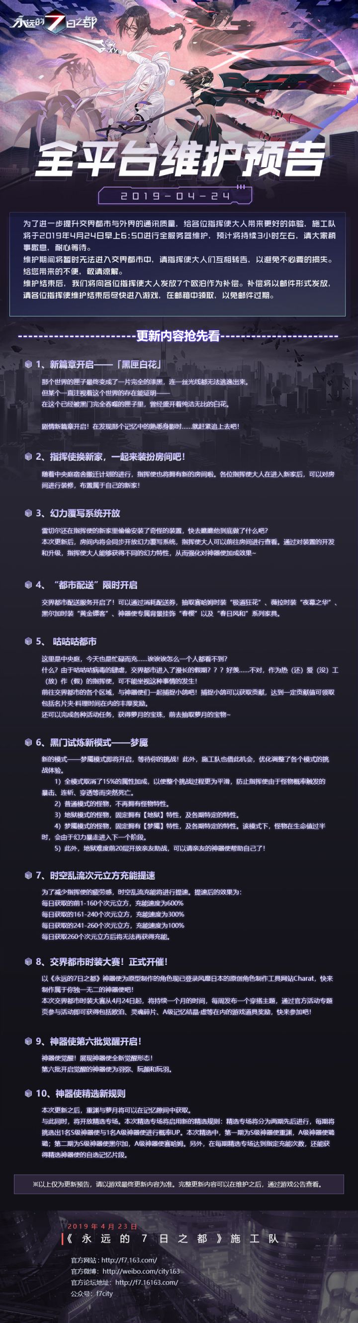 为了进一步提升交界都市与外界的通讯质量,给各位指挥使大人带来更好的体验,施工队将于2019年4月24日早上6:50进行全服务器维护,预计将持续3小时左右,请大家稍事歇息,耐心等待。本次更新之后,新篇章「黑匣白花」剧情开启,最新一批觉醒神器使将登陆游戏与各位指挥使见面。想要了解更多内容,请戳下方更新预告↓