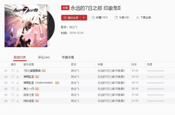 随着新篇章的开启,我们新增了5首新的原声音乐。今天阿官给大家带来陈达飞老师在@网易云音乐 新发布的游戏原声专辑《永远的7日之都 印象集II》!专辑里面包括了本次更新的5首全新剧情音乐,由陈达飞老师担任设计和作曲,并联合了国内著名管弦乐团——北京国际首席爱乐乐团,中国五大录音师之一的混音师陈珞,旨在让各位指挥使能够更享受游戏过程和剧情。还等什么,快去试听吧:https://music.163.c