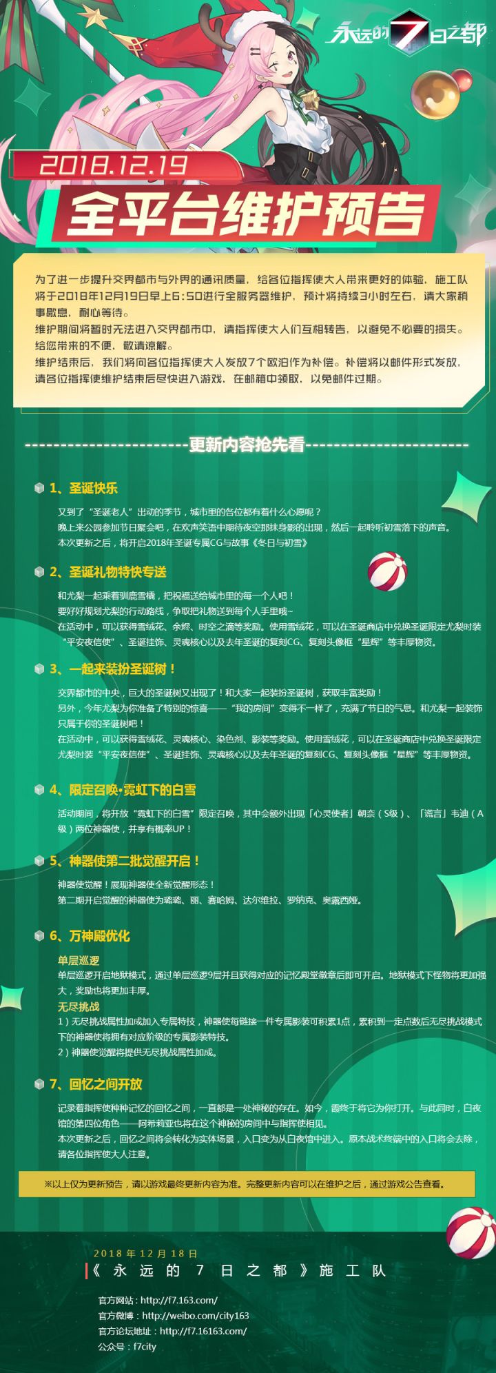 为了进一步提升交界都市与外界的通讯质量,给各位指挥使大人带来更好的体验,施工队将于2018年12月19日早上6:50进行全服务器维护,预计持续3小时左右,请大家稍事歇息,耐心等待。圣诞将至,系列圣诞活动欢乐上线。参与活动收集雪绒花,即有机会兑换尤梨限定时装“平安夜信使”;此外,新神器使朝奈和韦迪也将在本次更新后,在特殊隙间与大家正式见面。更多更新内容,戳下方更新预告了解
