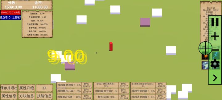 4、关卡难度我认为可以通过这几点实现①增加方块生命值(对应的奖励最好也增加);②方块移速;③刷怪频率;④新增BOSS(高生命值低移速)。