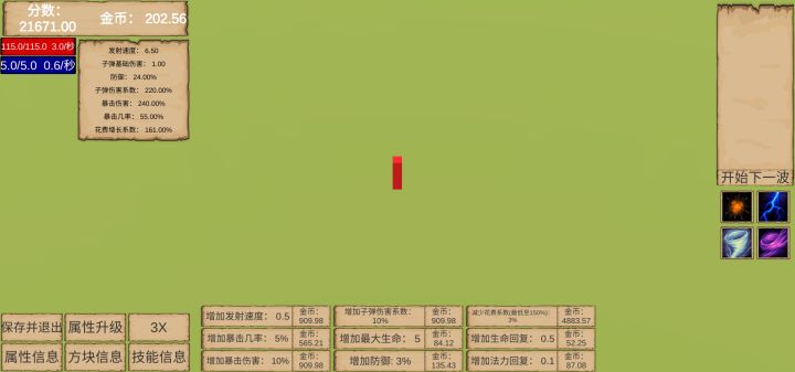 游戏每五局都会有技能或是金币可选,当没有没技能或是金币(有时候是增加生命上限)的时候,退出游戏,然后重新进去,就又有了(估计是个bug)。升级方案首先升级 减少花费系数,升两三级就够了,然后升级子弹发射系数,升到3.5停下,然后就是暴击几率,升级到0.35,然后就是暴击伤害,升级到1.7。然后回来继续升级花费系数,需要一直升满。刷钱方案一般是配合点击术,哪人多点哪。