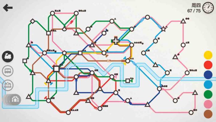 如果只用点与线,来设计一款游戏,你会在脑中构思怎样的作品?轨道交通。这款游戏,就将点、线的结合,放在了整个美感的设计中。还令人觉得,原来每日看来拥挤的交通工具,可以这么美。这款休闲游戏模拟了地铁线路的建造,玩家需要在不断出现的两点之间,桥接一条铁轨线。随着运输的扩张,会出现新的点,要不断改变线路的合理化,从而达到整个交通运输的流畅。意为,初期很短的线路,可以提高班次,这样代价也会比较小。客