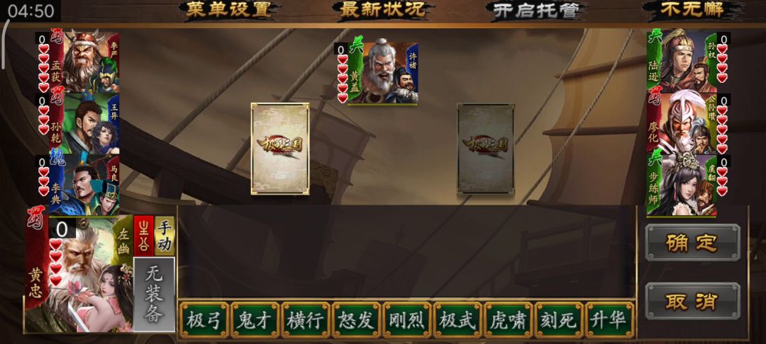 先拿标准练练手,双将黄忠是为了杀必中,破阵里必需要有青龙3才行(开个钻石会员,天天打破阵几天就刷出来了) 杀+1,怒发+1,极武+1,酒+1,虎啸+1,稳定5血,刚烈第一个6血。要是手牌有属性杀,那么左幽皮肤+1,就是稳定6血,第一个7血! 破阵里,就算一轮没杀光,虎啸副作用翻面,那么刚烈7+4×6=31张,虎啸+5张。36张牌怕啥。