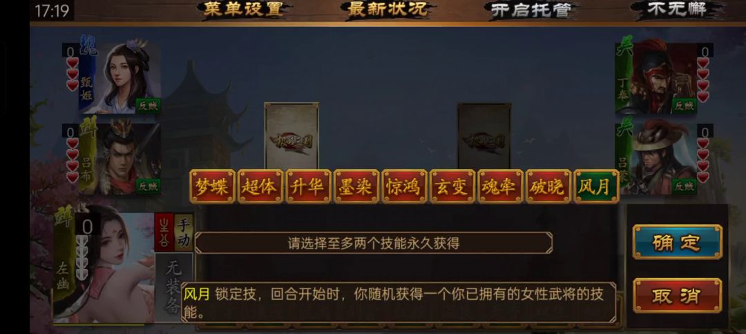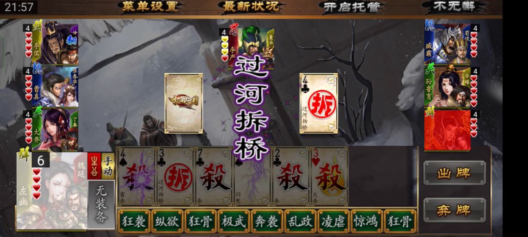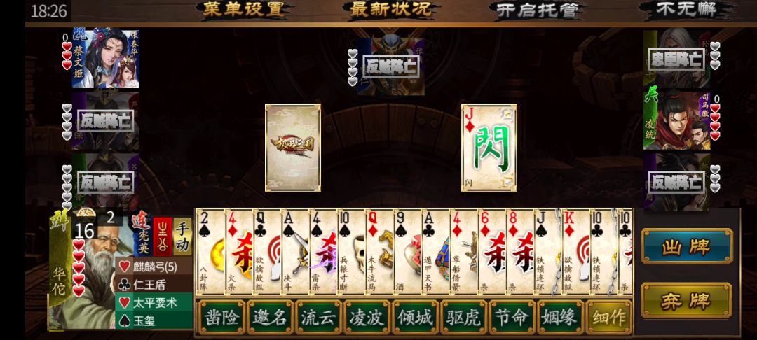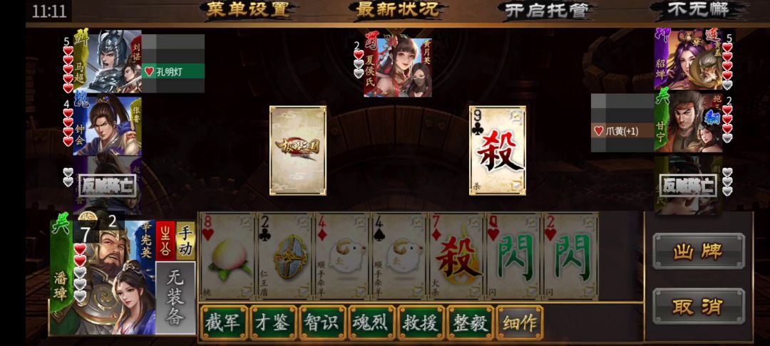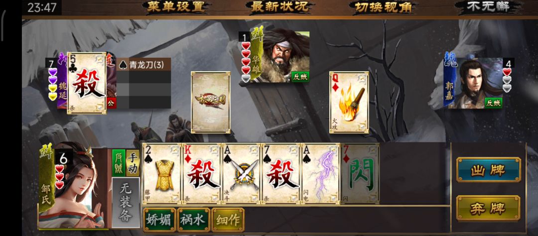 好好的一个三国杀愣是玩成了狼人杀,三个队友都没活过一轮就GG了,剩我一个吓得瑟瑟发抖,由于我没有暴露过什么反贼的行为,这些ai分析不出来谁是最后一个反贼,接下来就是拼演技的时候了,我偷摸的发育,他们互相伤害,看谁忍到最后,内奸是第一个忍不住的,面对三个忍了半天,饥渴难耐的大汉,结果自然是凉凉,接下来是神张辽,不知道怎么惹到主公了,然后就被推出去砍了,这时候已经发育的兵强马壮的我,还收拾不了剩下的两