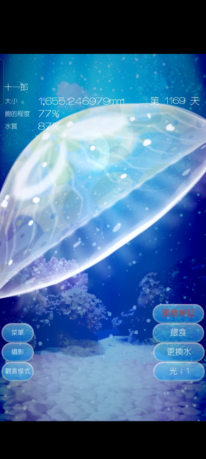 但时间过了又过,我又喜欢上了这种感觉,下班回家拿上平板,把电子小猫喂喂,又把旅行青蛙的行李准备好,让它去替我看这个世界,再者就是我的小水母,无聊,还是觉得无聊,像我的生活一样,每天在鱼缸里游一游,再装一装缸壁,它又何尝不是另一个我呢?